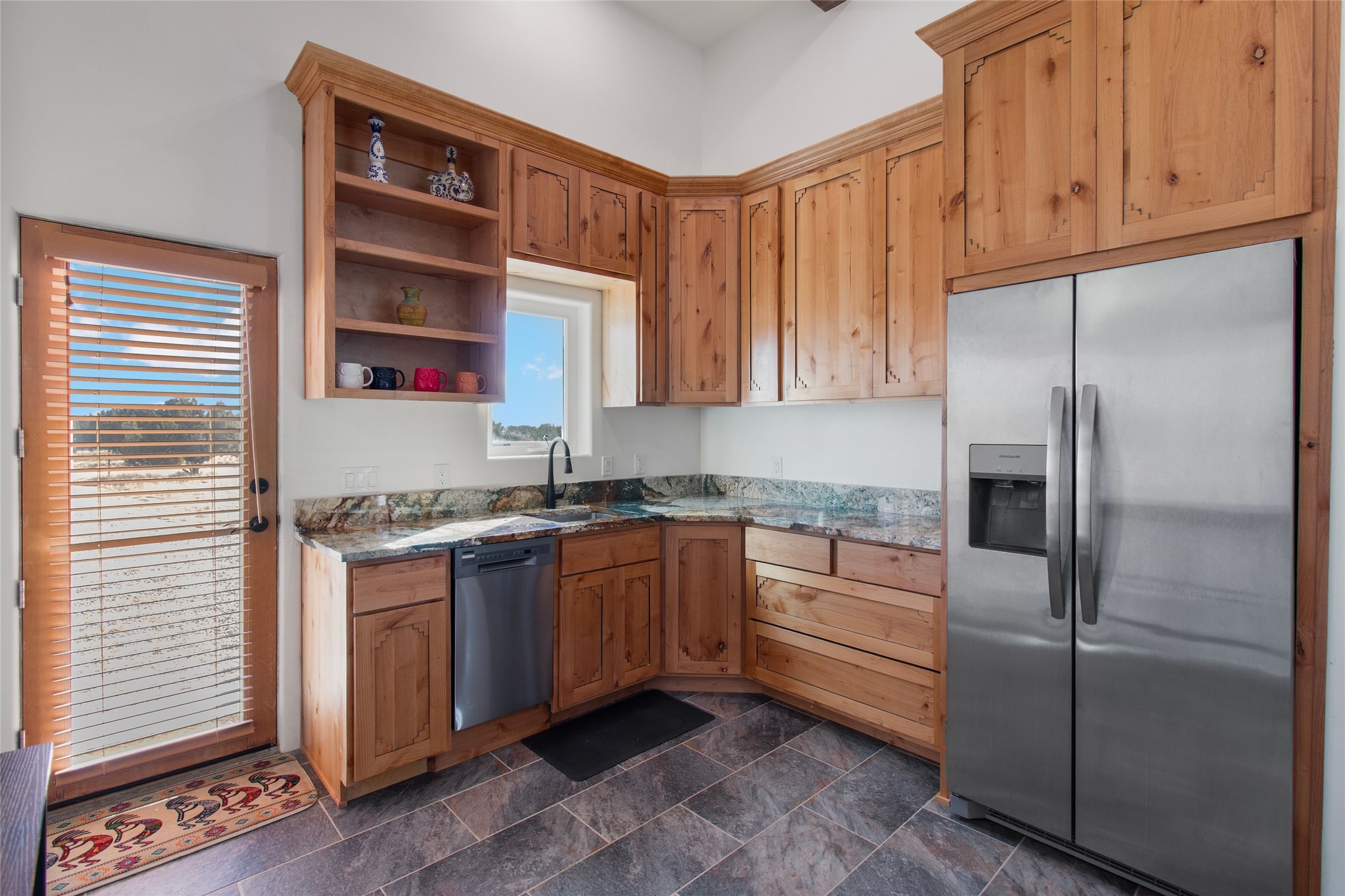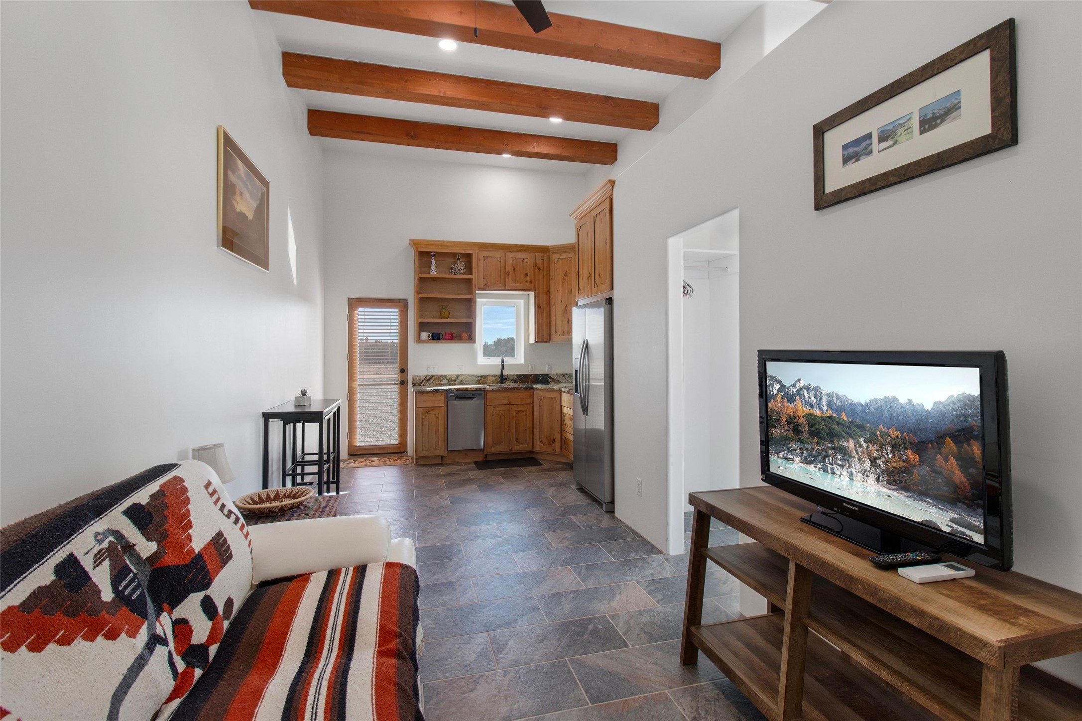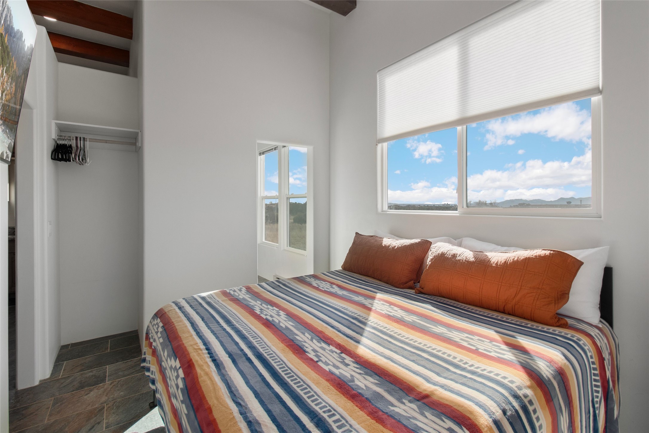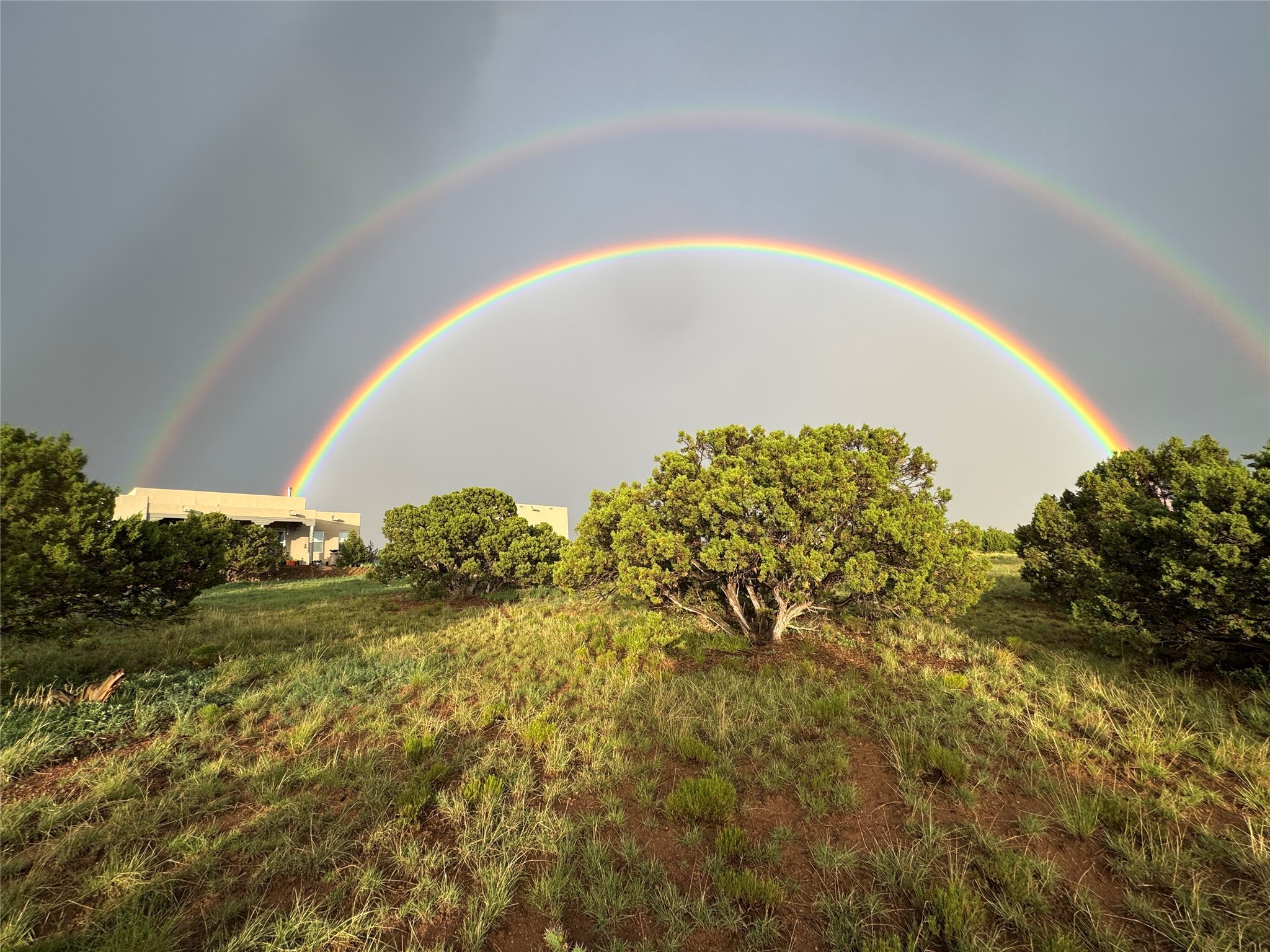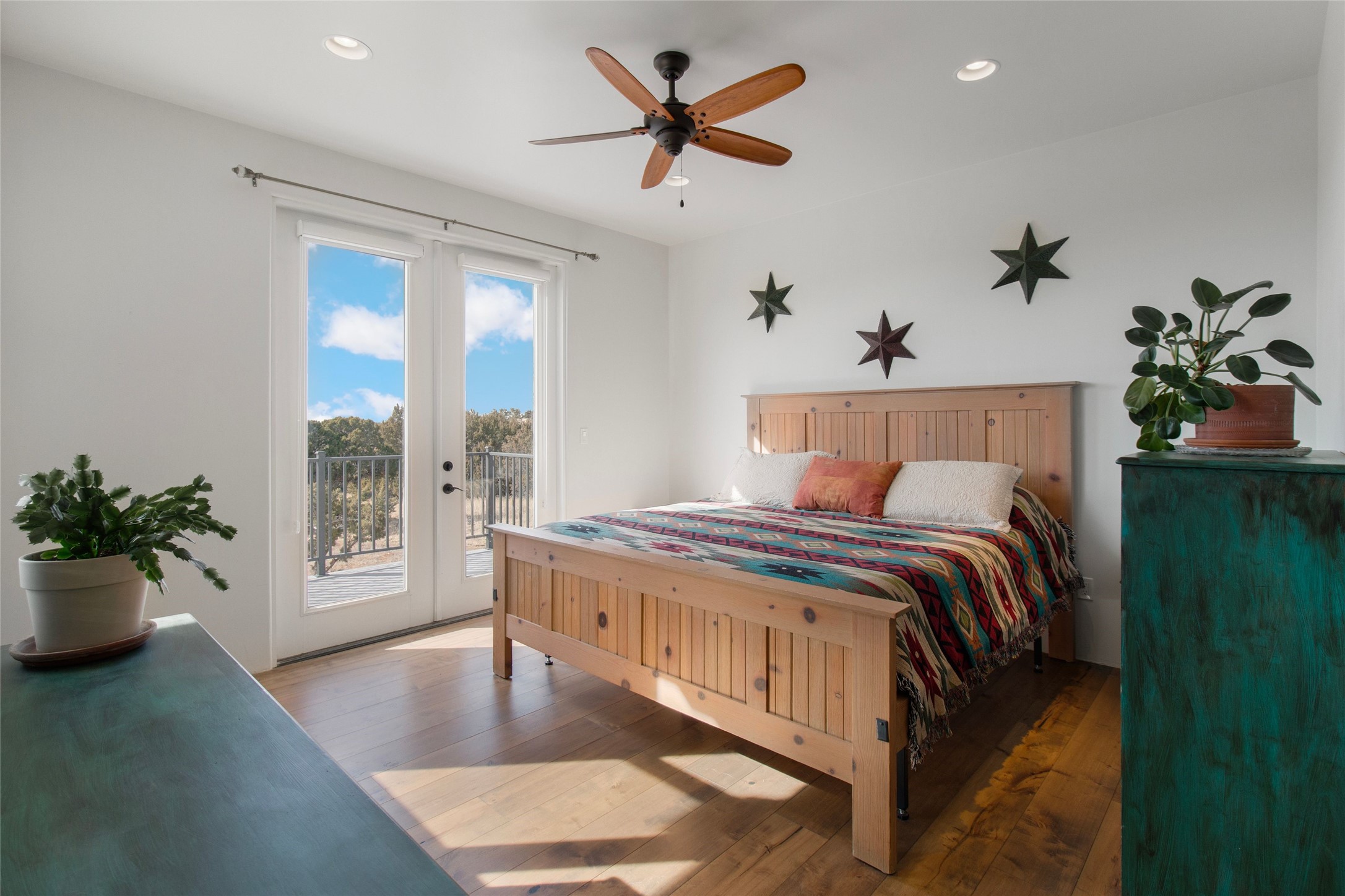 Pride of ownership is apparent the minute you walk into this exceptional 2019 contemporary build in Eldorado. Sellers have invested approximately $140,000 in improvements, included the construction of a new casita, during their ownership. Upon entry into the front court yard, you are greeted by apple, peach and cherry trees. The main house offers 3 bedrooms, 2 baths and open living concept with a split bedroom configuration for owner and guest privacy. Stunning views from the living room and back portal await you on this 1.4 acres. This home was built for energy efficiency as a priority with a HERS rating of 70. A solar panel system attached to the grid was added to the home in 2024 for ultra low electric bills. A Hearthstone Green Mountain convection wood stove takes the chill off those really cold winter evenings. An annually serviced tankless water heater ensures you never run out of hot water. Central cooling and heating. A detached one bedroom casita with a 3/4 quarters bathroom is perfect for guests or an in-law suite, plus an adjacent RV garage. For all the amenities available to homeowners in Eldorado, check out www.eldoradosf.org