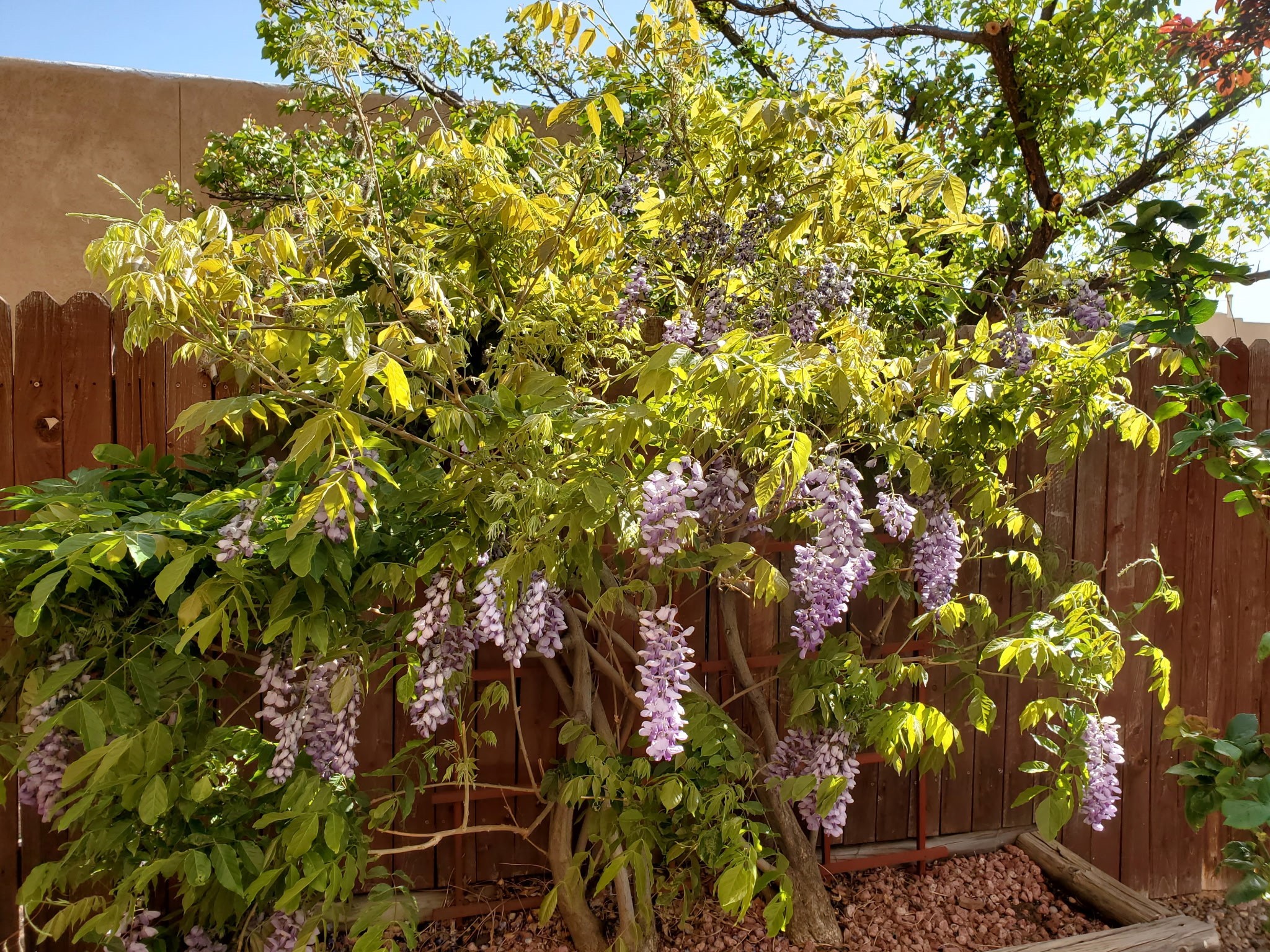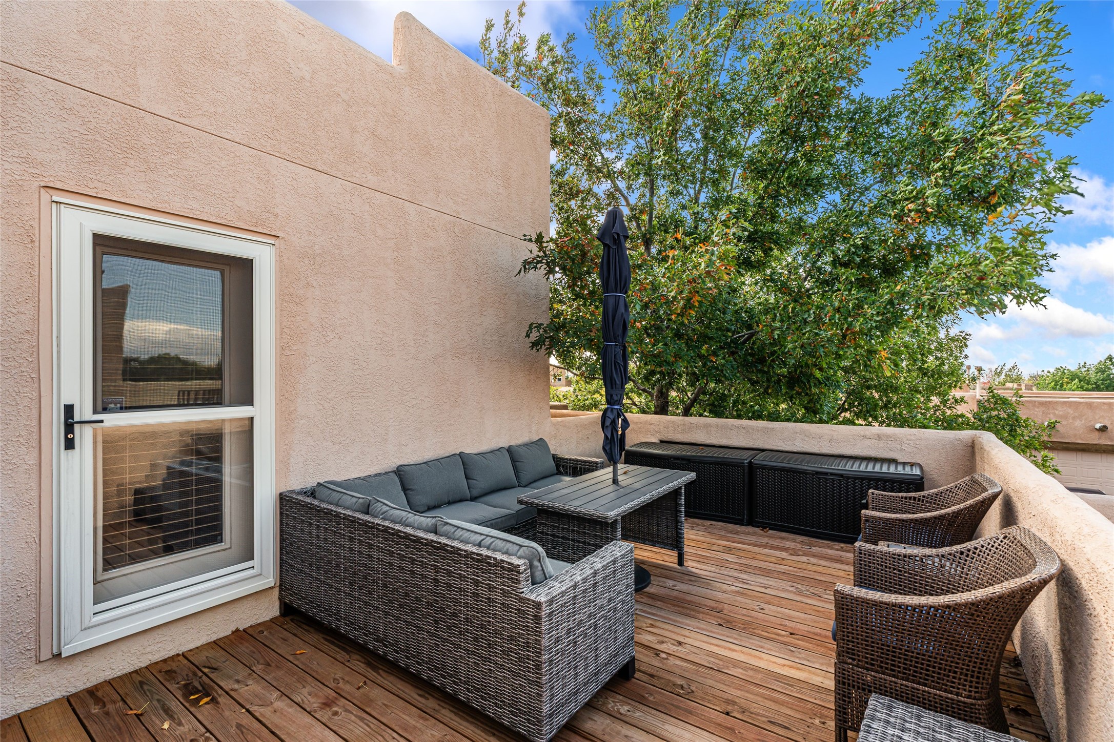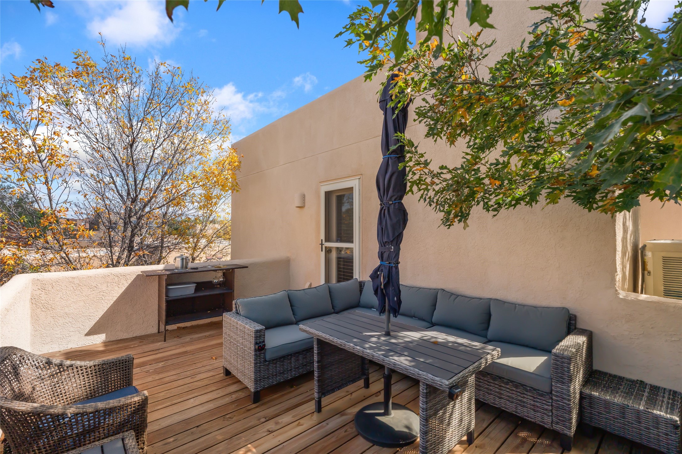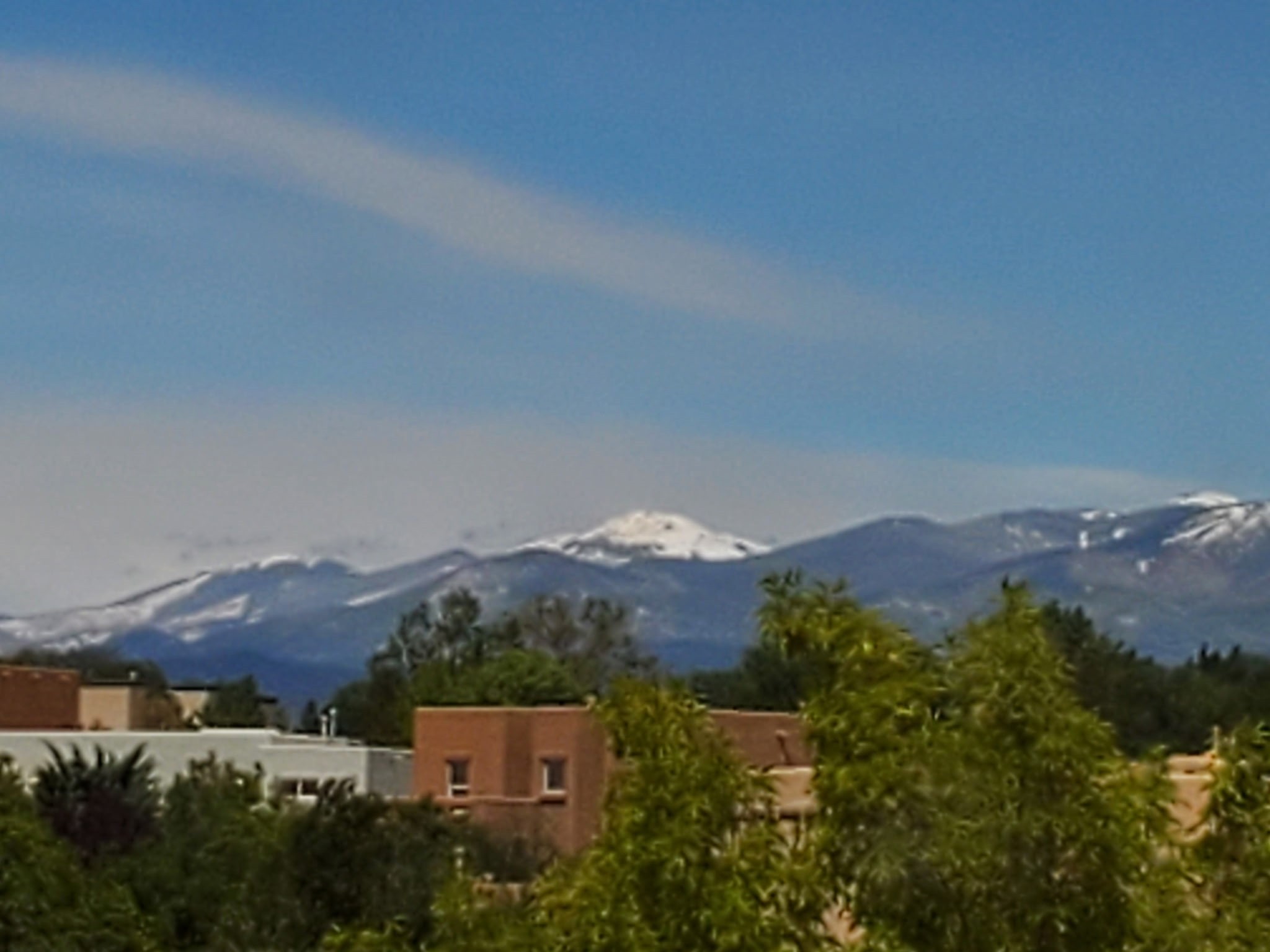 Well maintained and updated 2 story home on a corner lot with Sangre and sunset views. 3 bedrooms upstairs with 2 full bath rooms. Primary bedroom has access to roof deck. Downstairs includes a office/den, separate formal dining room, comfortable living room with a gas fireplace, and a well appointed kitchen with newer appliances and upgraded granite counter tops. Outside is a relaxing gem of an outdoor 'living' room complete with ceiling fans and room to bar-b-que. All the outdoor furniture conveys - including a water feature and fire pit. Numerous healthy fruit trees and rose bushes, front yard has 2 gorgeous heritage maple trees. Attached garage, newer washer and dryer, recently re-siliconed roof - this house is ready to move in and make your own!