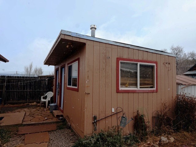 If you are looking for peace and quiet, lovely views that include sunsets, come and look at this house! Enjoy the joys of small-town life in this charmer! Situated east of the center of Pecos and the Pecos River in East Pecos, there are mountain views from the property, and the surrounding properties have beautiful rock formations. Two bedrooms, one bath, large living room which is a later addition to the main house. New laminate flooring in the whole house, new toilet, and new hot water in 2022-23. The main house has a second living area with dining area. The country chicken sink is the focal point of the kitchen. The older/smaller living area could potentially be turned into a third bedroom. Partially enclosed front porch. A large building in the back is divided into two spaces, a studio on one side and storage on the other. It has electricity, and heating on the right (larger) side. The property is completely fenced, with an apple tree, dwarf crabapple, and grape vines.