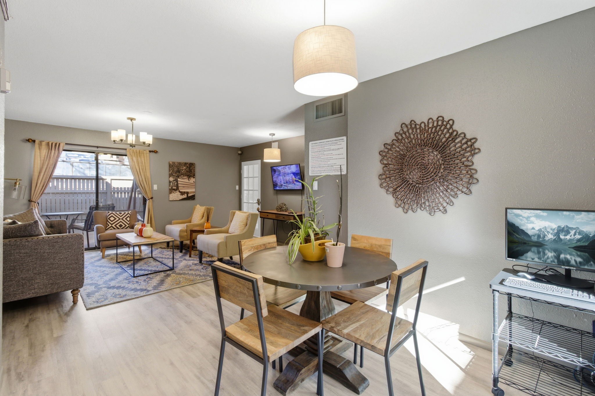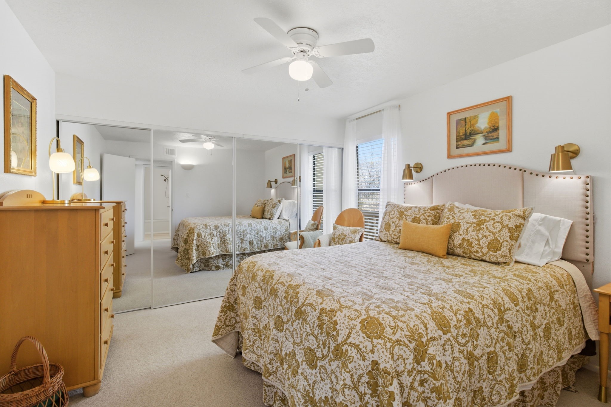 Bathed in natural light, this south-facing second-floor end-unit condo is a rare offering in The Reserve, one of Santa Fe's most desirable condominium communities, currently undergoing a complete refurbishment. Ideally located just minutes from downtown and close to shopping, dining, and city amenities, the home offers both convenience and a peaceful retreat.This quiet and private 2-bedroom, 2-bath residence is among the most beautifully designed homes in the community. The spacious living room opens through a sliding glass door to a sun-filled south-facing balcony with an electrified storage closet, ideal for bikes, gear, or projects. The updated kitchen features track lighting, a deep sink, tile countertops, and a generous pantry. Improvements throughout include new plugs and switches, newer carpeting in living areas, and tile flooring in the kitchen and baths.The guest bath includes a two-year-old deep soaking tub with acrylic surround to the ceiling, updated lighting, and tile counters. The primary bedroom enjoys southeast light, a ceiling fan, and a walk-in closet with washer and dryer. Its updated bath includes newer lighting and a linen closet. The second bedroom offers a full wall of mirrored closets with hanging rods and a built-in chest of drawers.With beautiful views and excellent south-facing solar gain, this home is comfortable and inviting. Community amenities include a year-round heated pool, spa, exercise room, lush landscaping, and a newly constructed city walking path along the eastern perimeter. Light-filled and move-in ready, this exceptional home stands out.