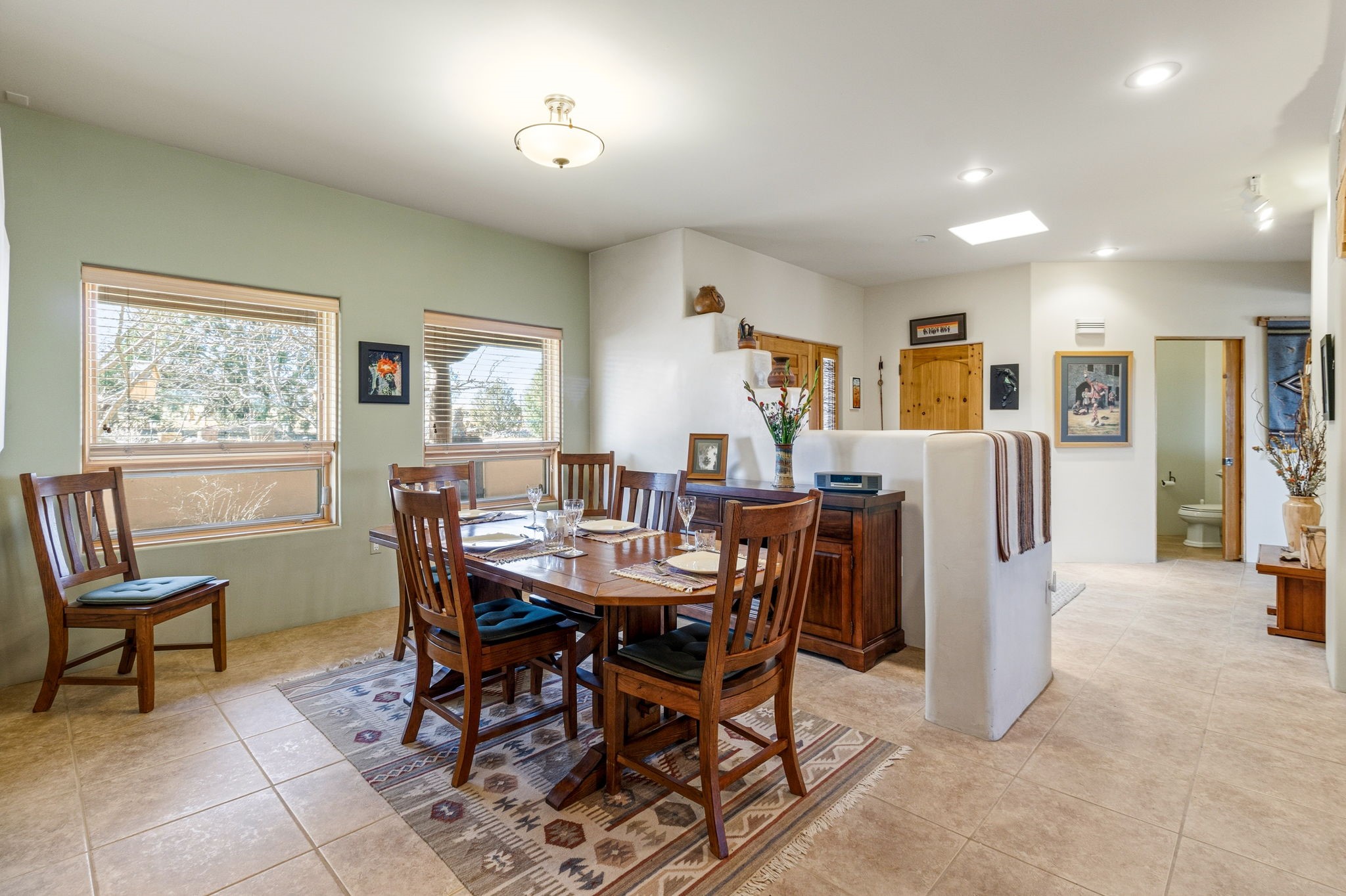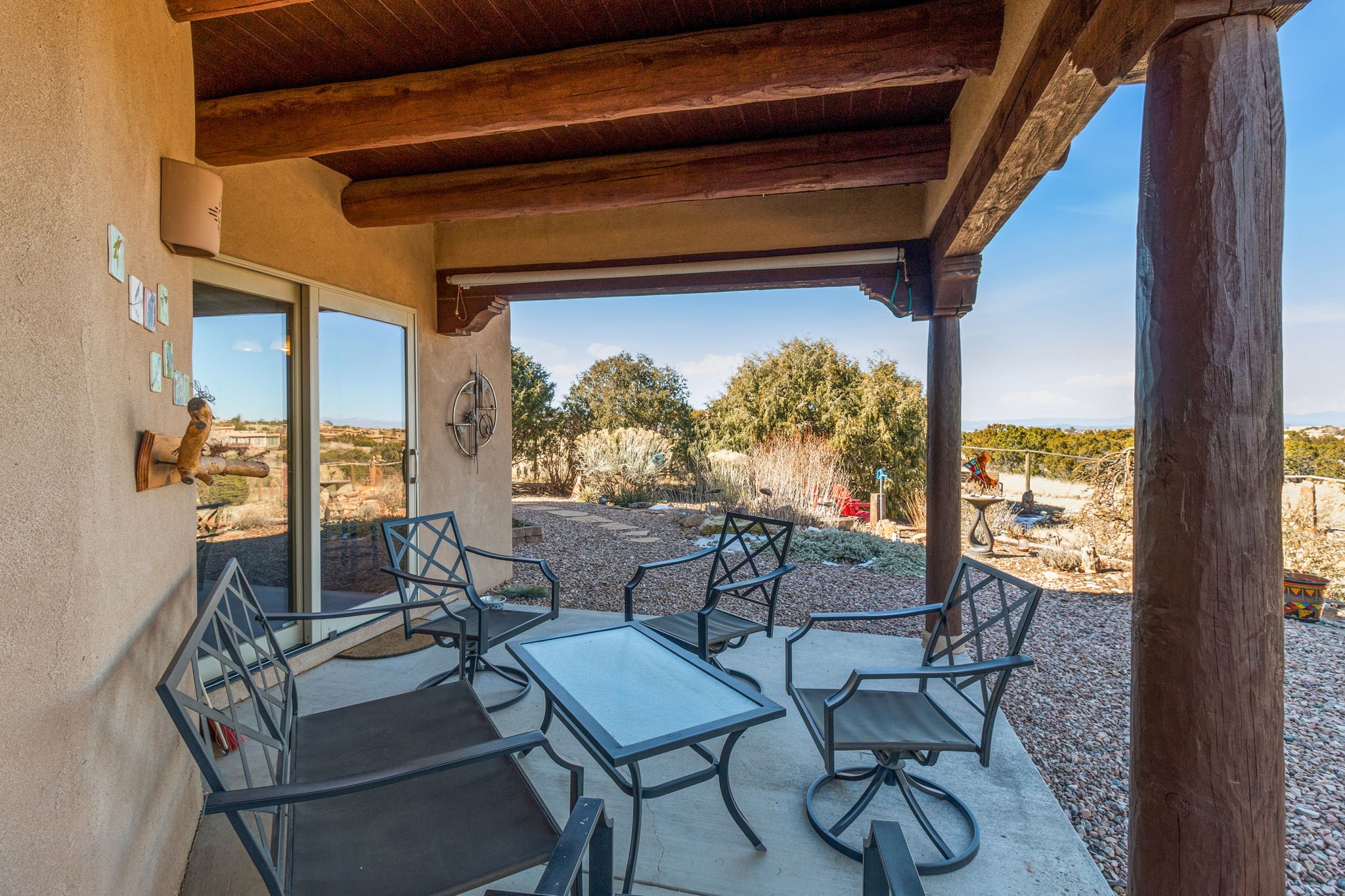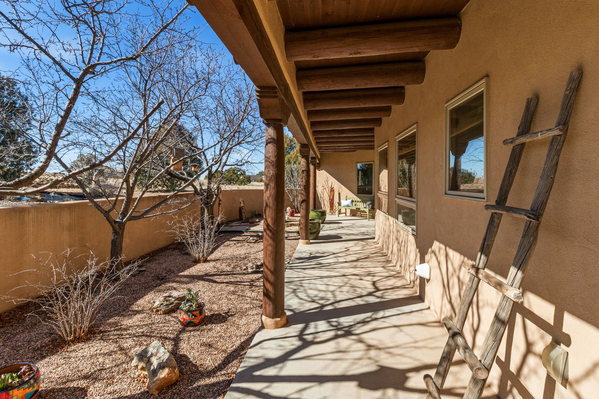 A true standout single-level Eldorado property offering views, privacy, and exceptional features. Sited on a greenbelt, this beautifully maintained home combines comfort, efficiency, and thoughtful design. The spacious, well-appointed kitchen features newer stainless appliances, granite counters, a reverse osmosis system, and a generous walk-in pantry. A sunny breakfast area with glass doors open to the rear portal, creating an ideal indoor-outdoor flow. A convenient powder room is located just off the kitchen. The beautifully landscaped backyard includes a water feature and pondless waterfall. The fully fenced backyard looks out to the Jemez Mountains and provides multiple seating options to enjoy thIs peaceful outdoor retreat and spectacular sunsets. A 1,200-gallon cistern with new pump captures rainwater from the roof. The primary suite offers a walk-in closet, double sinks, and a separate soaking tub and shower. Well-separated bedrooms enhance privacy and functionality. Two mini-splits in the primary and guest bedrooms provide heating and air conditioning. The long front portal with traditional vigas overlooks a walled courtyard and offers a sunny south facing entrance to the home with three mature flowering trees. A separate third garage bay, 345 square feet, has in-floor radiant heat and is ideal for a studio, home office, or workout space, while the finished attached two-car garage adds convenience and storage. Additional highlights include tile and wood flooring throughout, radiant heat, roof-mounted solar panels for low utility costs, a laundry room with newer Electrolux washer and dryer on pedestals, utility sink, and ample storage, plus a storage shed. This rare offering checks all the boxes: NO STEPS, NO CARPET, NO KITEC (Wirsbo) tubing, all on a paved road. Recent roof maintenance and a new water heater in 2023 add peace of mind. A pre-listing inspection with repairs noted is available upon request. Seller requires leaseback through April 21, 2026.