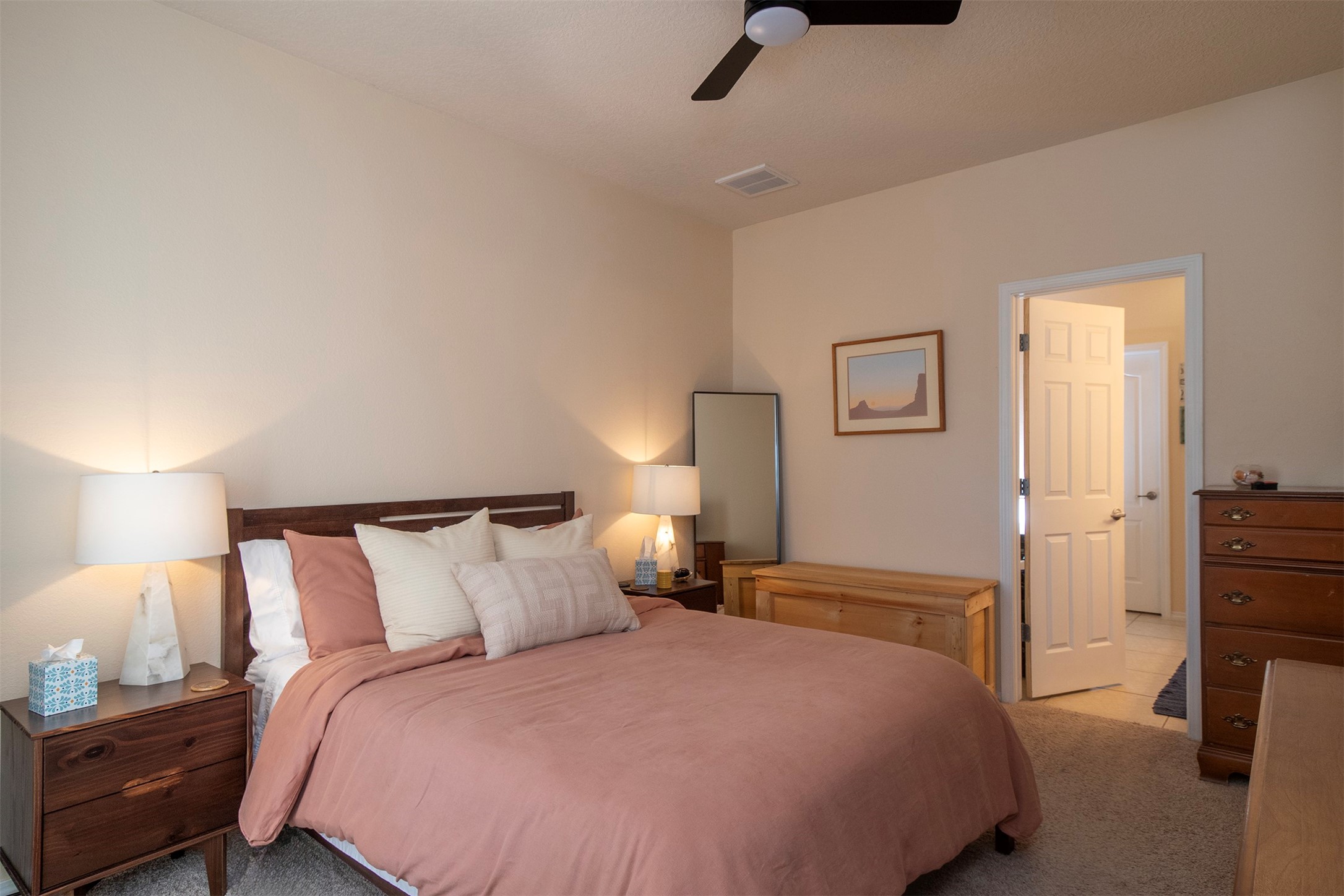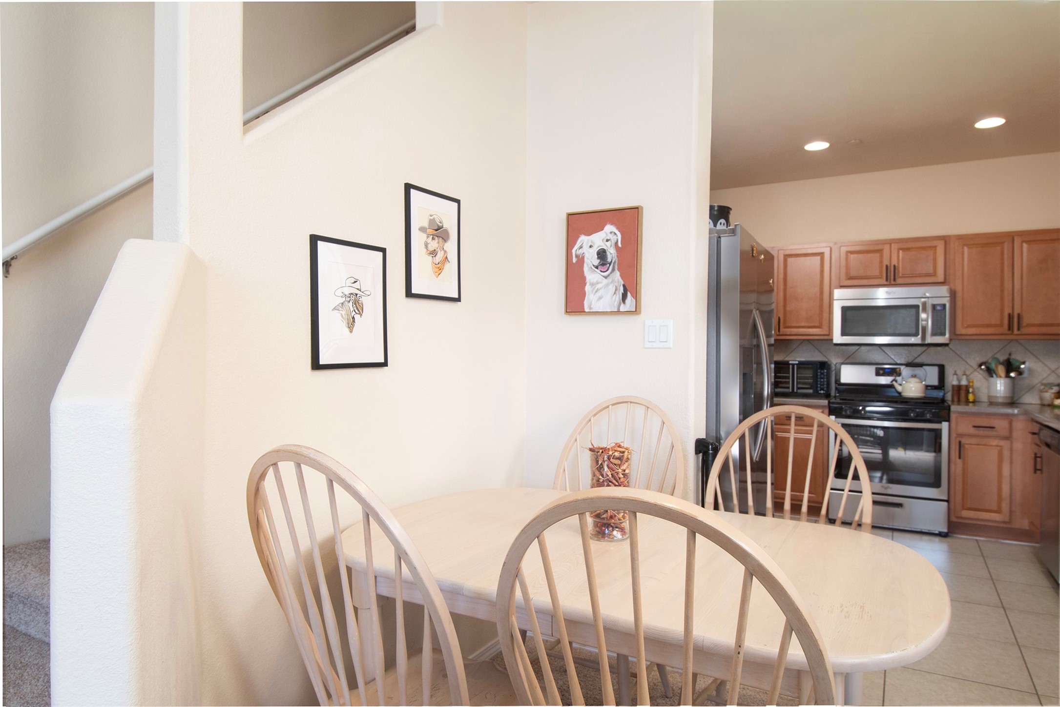 RANCHOS SANTOS MEDITERRANEAN MODERN. Modern Living in Ranchos Santos Condos of Santa Fe. Tucked away on a cul-de-sac, this Spanish Mediterranean style 2 Bed, 2 Bath, 2 Car garage condo has a convenient and beautiful lifestyle with nearby conveniences to grocery stores, restaurants, and shopping centers. This move-in ready two floor plan features with 18' ceilings in the Living Room that give an elevated and airy feel to the whole space. Great kitchen with modern appliances, wood cabinetry, matte black hardware, solid countertops. Open floor-plan with a first floor Bedroom Suite with private, enclosed patio, en-suite bath with separate shower, soaking tub and walk-in-closet. Upstairs is a second bedroom, full bath, laundry room and a fantastic open loft. The large loft space is ideal for home office, flex and remote workers space, - ideal for office, yoga workout area, or second living area. The garage offers great space for storage. Features include refrigerated air conditioning, 2 car direct entry garage, solid surface kitchen countertops, upgraded cabinets, Dish Washer, and Range, microwave, tile flooring, ceiling fan. Built in 2009 by Centex Homes.