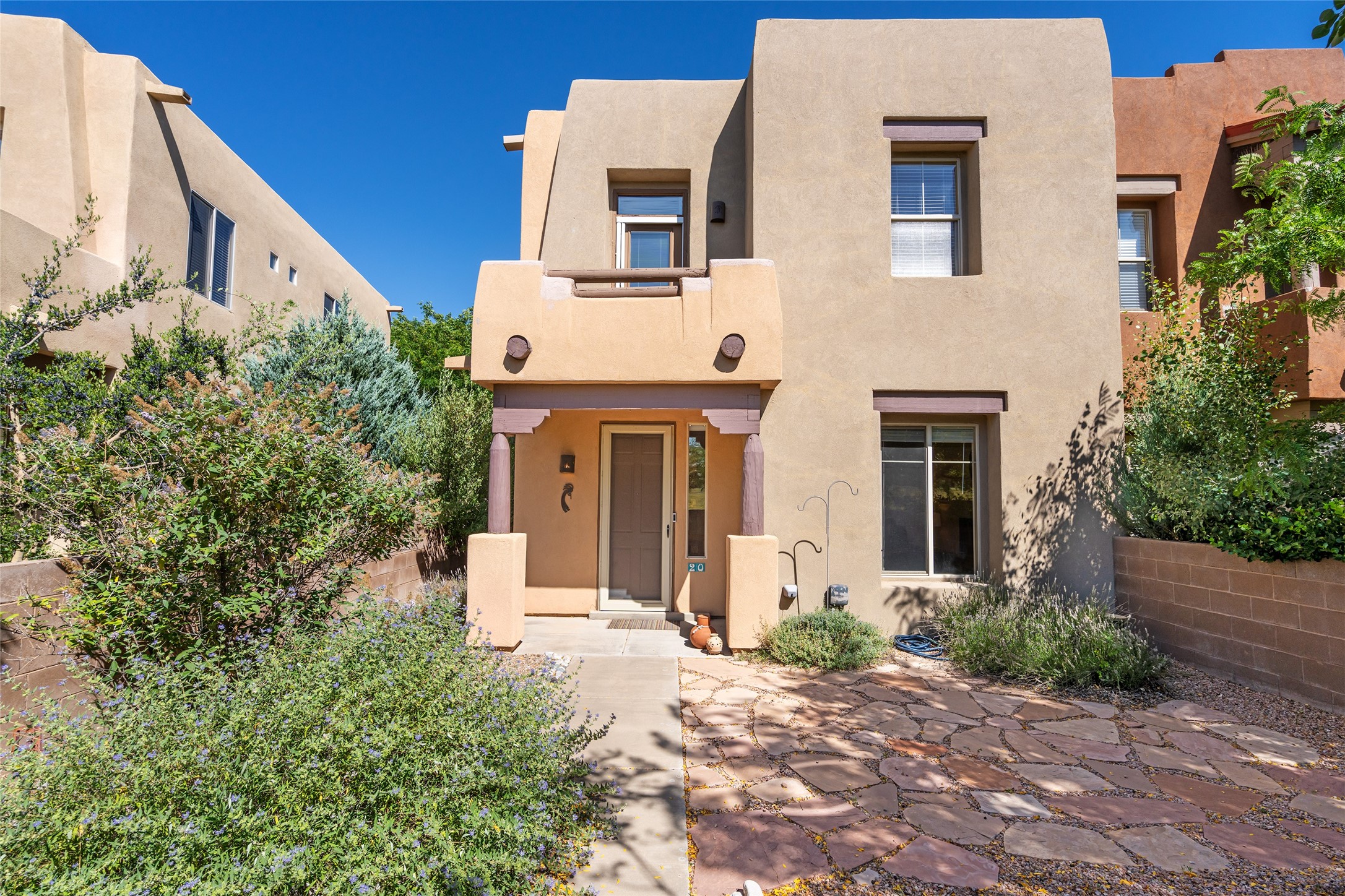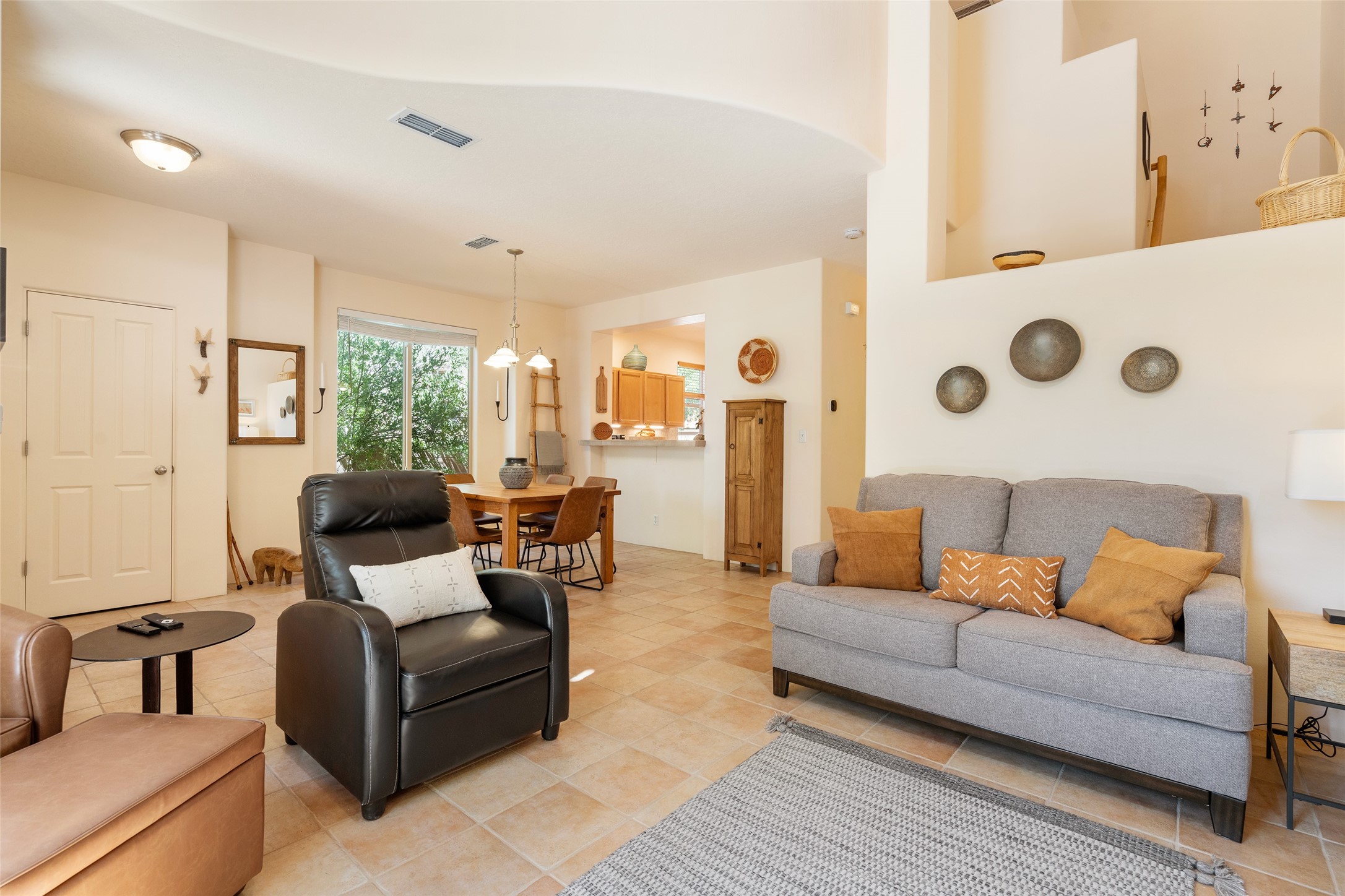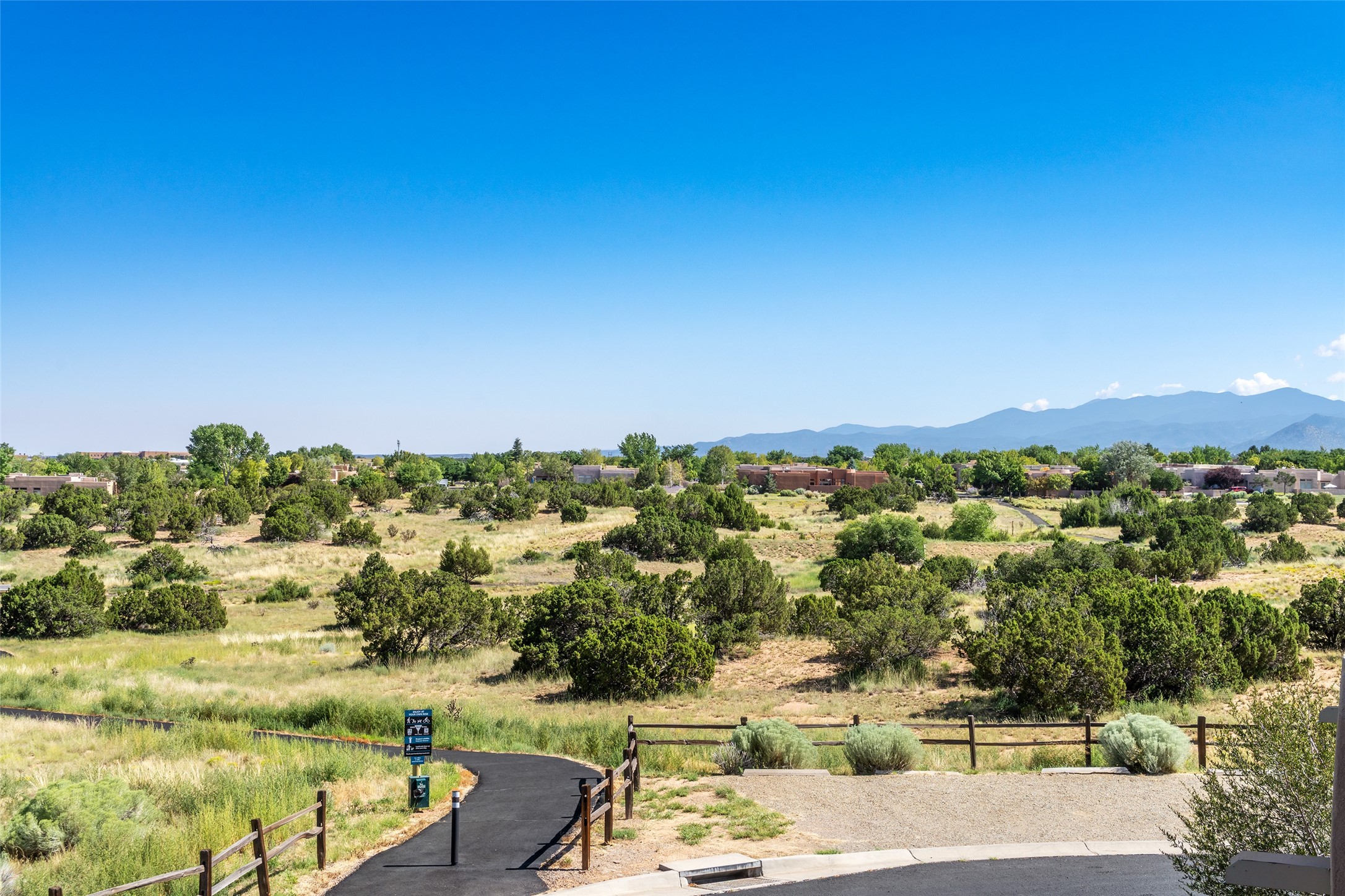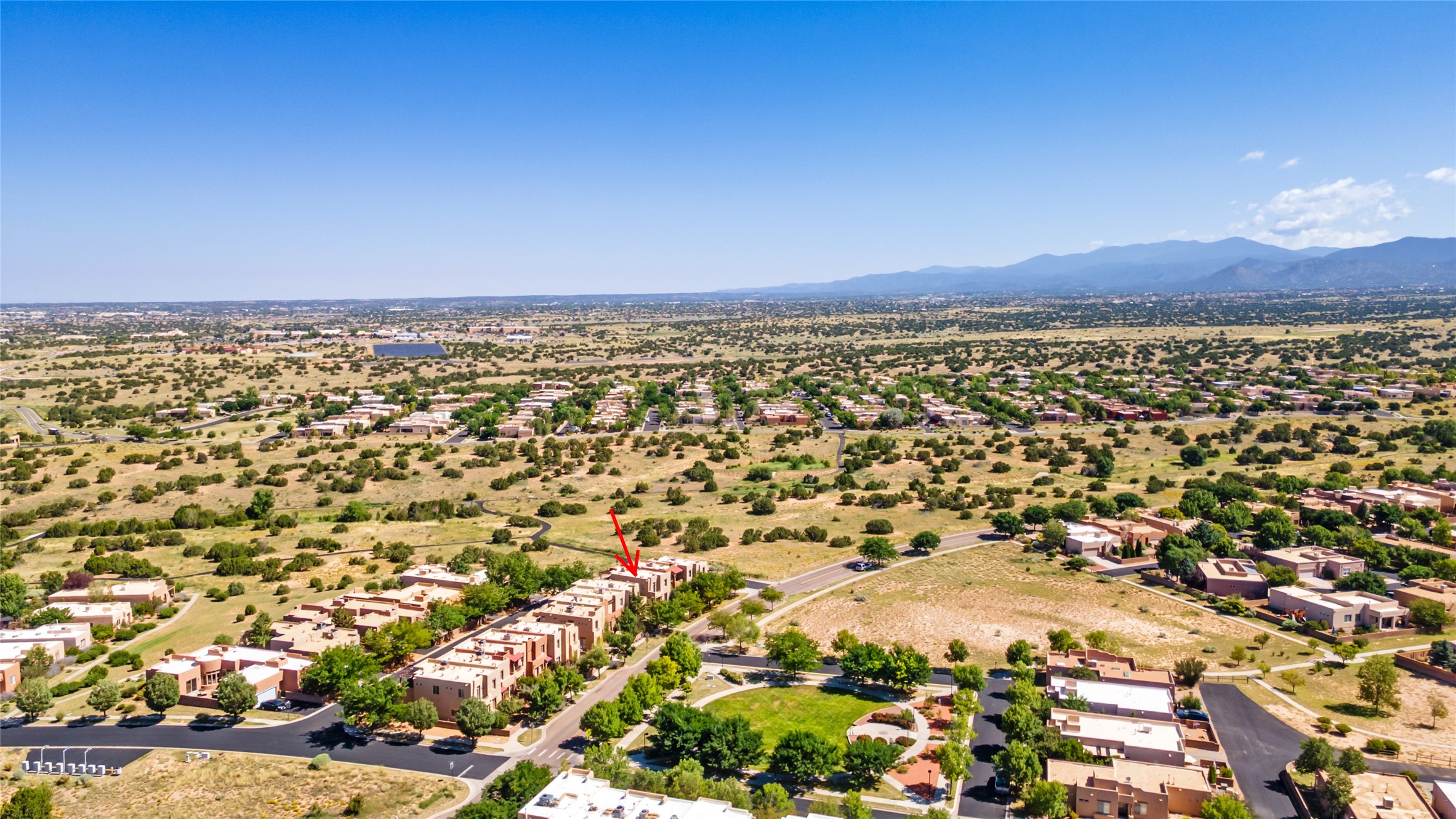 So lightly lived in, you'll be amazed at its pristine condition! Plus, a brand new heating and cooling HVAC system just installed! Located in the desirable Windmill Ridge area of Rancho Viejo, this turn-key property is ideal for full-time living or as a low-maintenance lock-and-leave aided by a smart thermostat Ecobee which is accessible through a smart phone. The main living area features beautiful tile floors and a soaring 20-foot ceiling, creating an open and expansive feel. A charming gas kiva fireplace, vigas, and wood ceilings add authentic Santa Fe warmth. The kitchen offers generous storage within maple cabinetry, complemented by soft neutral-toned tile countertops. A convenient laundry room and powder bath are located on the main level. Upstairs, a versatile loft provides the perfect space for a home office, media area, or reading nook, complete with a small balcony overlooking southern views and the neighborhood park. The primary suite boasts its own spacious balcony with sweeping views of designated open space and both the Jemez and Sangre de Cristo mountains. This immaculate home is part of a welcoming community featuring over 12 miles of paved walking trails, multiple parks, and an active HOA. Exterior maintenance is included in the townhome dues, making for stress-free living. Priced to sell and ready for its next owner!