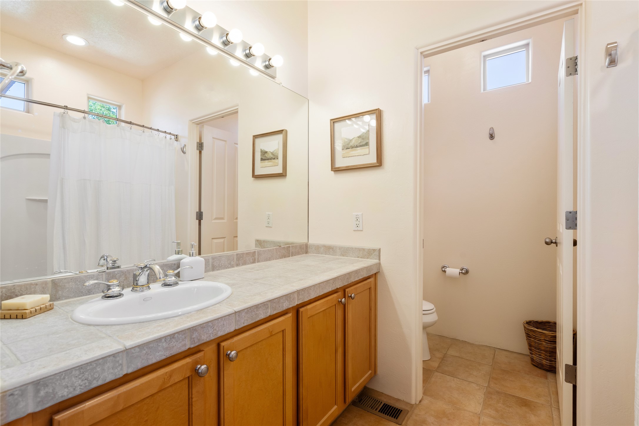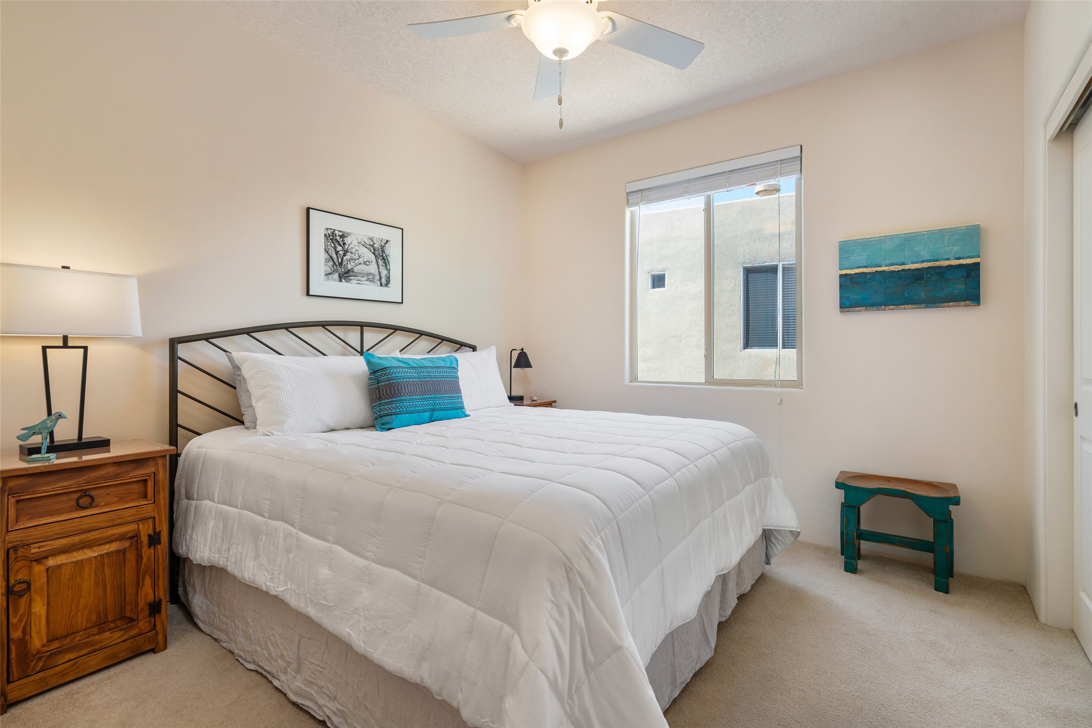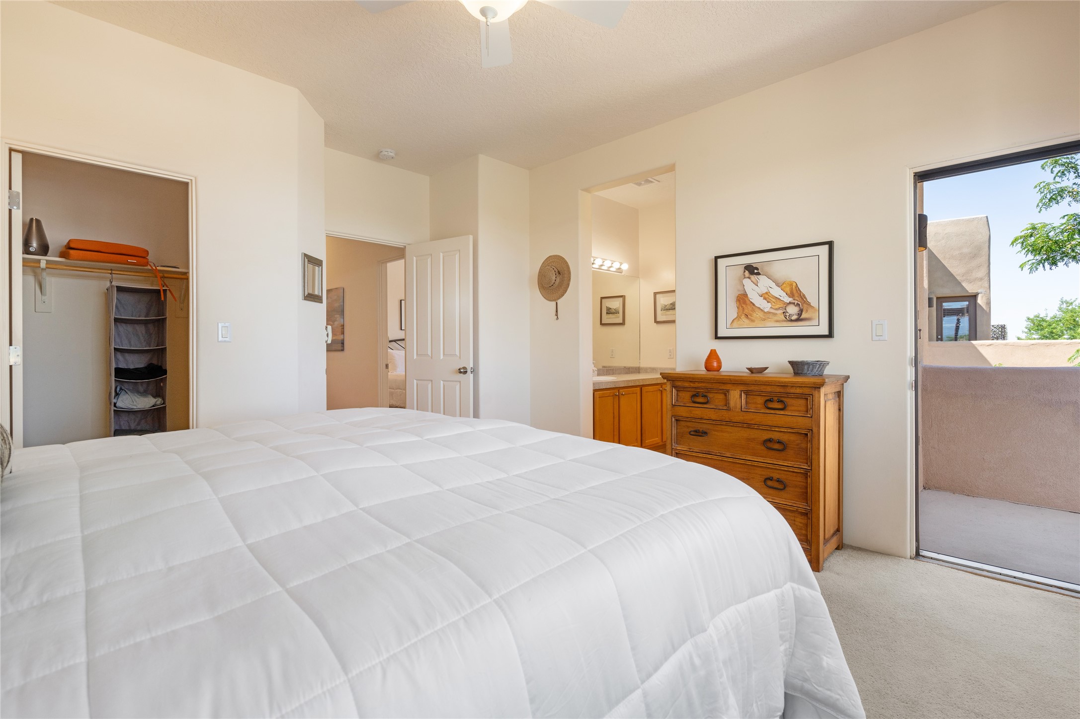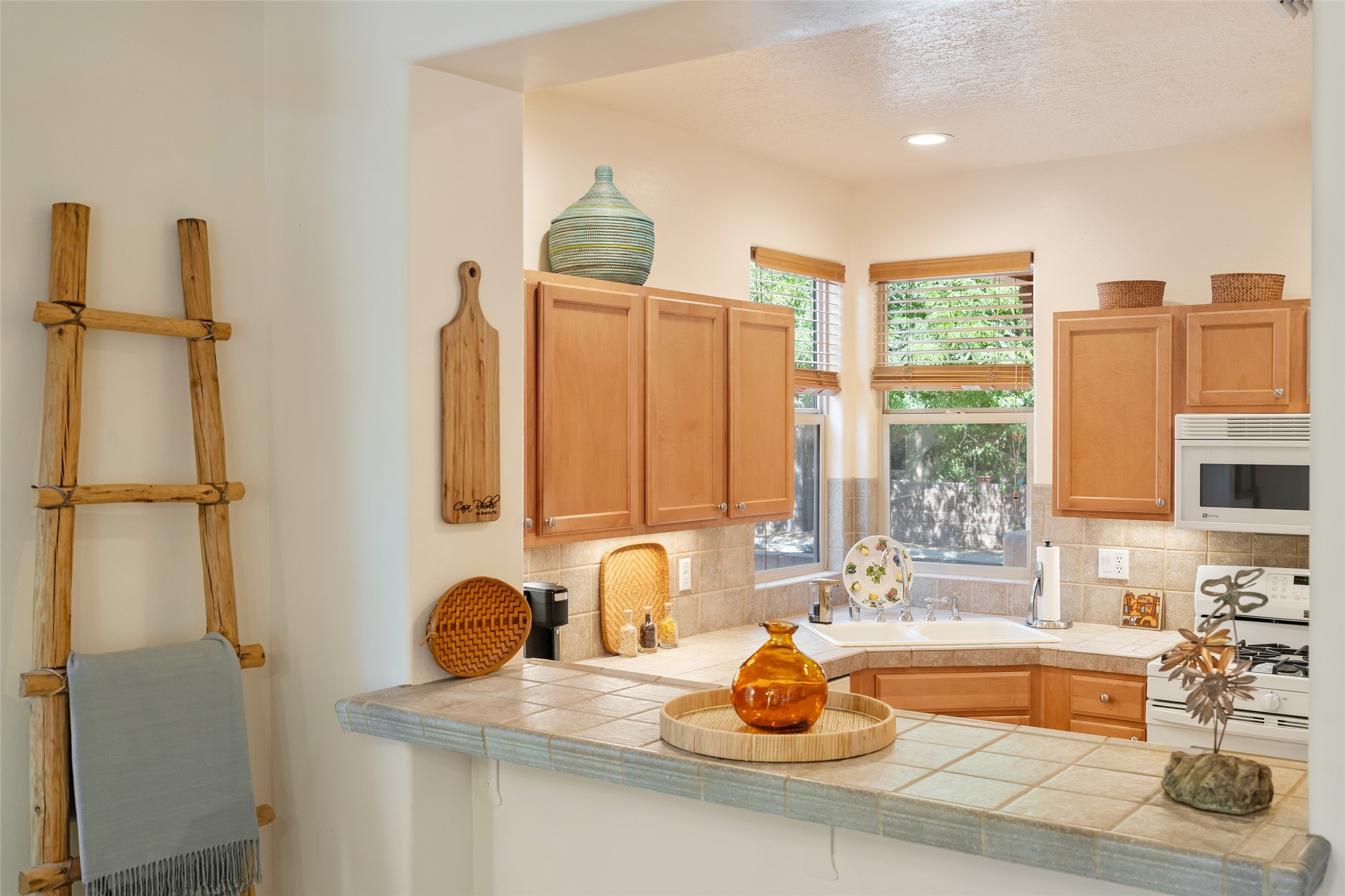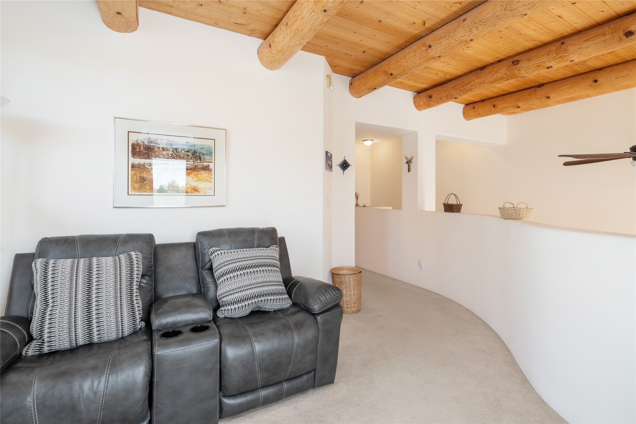 So lightly lived in, you'll be amazed at its pristine condition! Plus, a brand new heating and cooling HVAC system just installed! Located in the desirable Windmill Ridge area of Rancho Viejo, this turn-key property is ideal for full-time living or as a low-maintenance lock-and-leave aided by a smart thermostat Ecobee which is accessible through a smart phone. The main living area features beautiful tile floors and a soaring 20-foot ceiling, creating an open and expansive feel. A charming gas kiva fireplace, vigas, and wood ceilings add authentic Santa Fe warmth. The kitchen offers generous storage within maple cabinetry, complemented by soft neutral-toned tile countertops. A convenient laundry room and powder bath are located on the main level. Upstairs, a versatile loft provides the perfect space for a home office, media area, or reading nook, complete with a small balcony overlooking southern views and the neighborhood park. The primary suite boasts its own spacious balcony with sweeping views of designated open space and both the Jemez and Sangre de Cristo mountains. This immaculate home is part of a welcoming community featuring over 12 miles of paved walking trails, multiple parks, and an active HOA. Exterior maintenance is included in the townhome dues, making for stress-free living. Priced to sell and ready for its next owner!