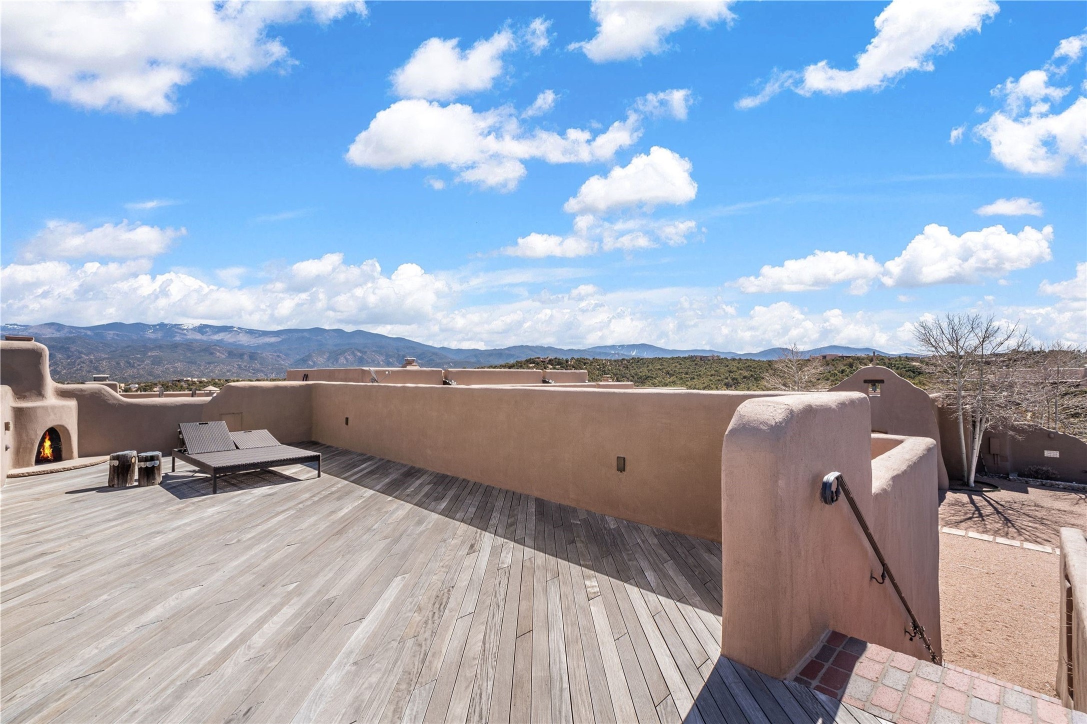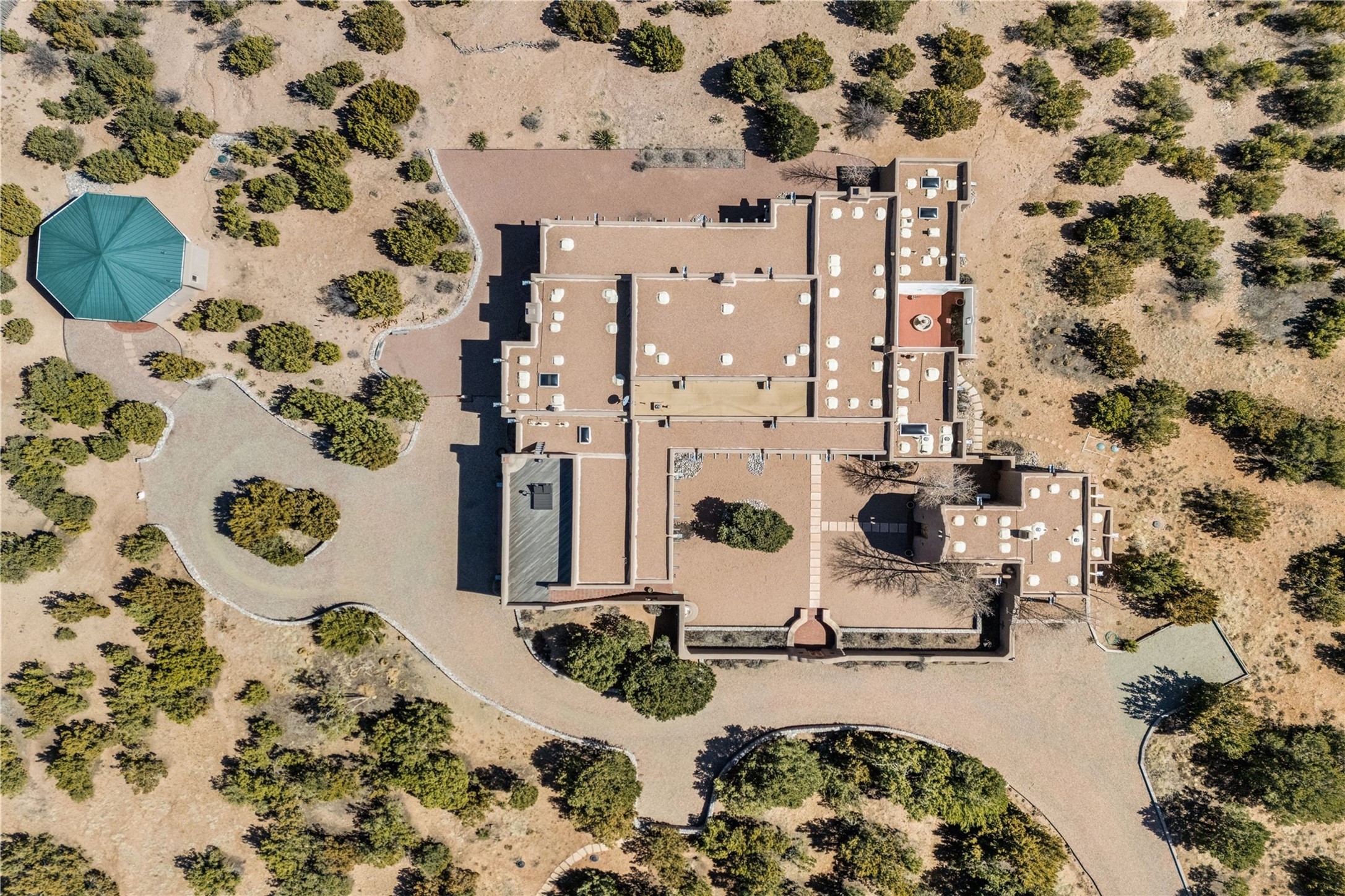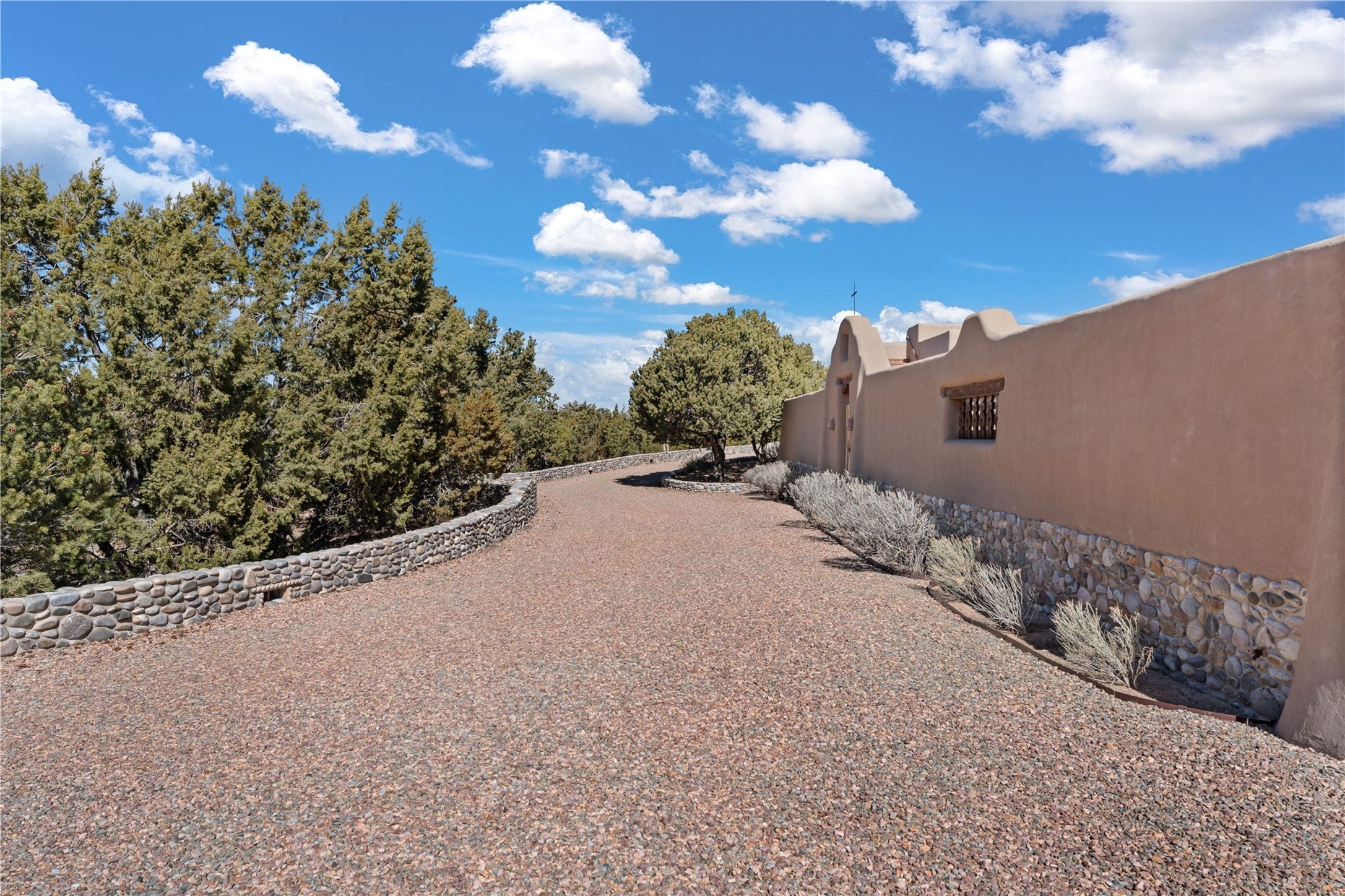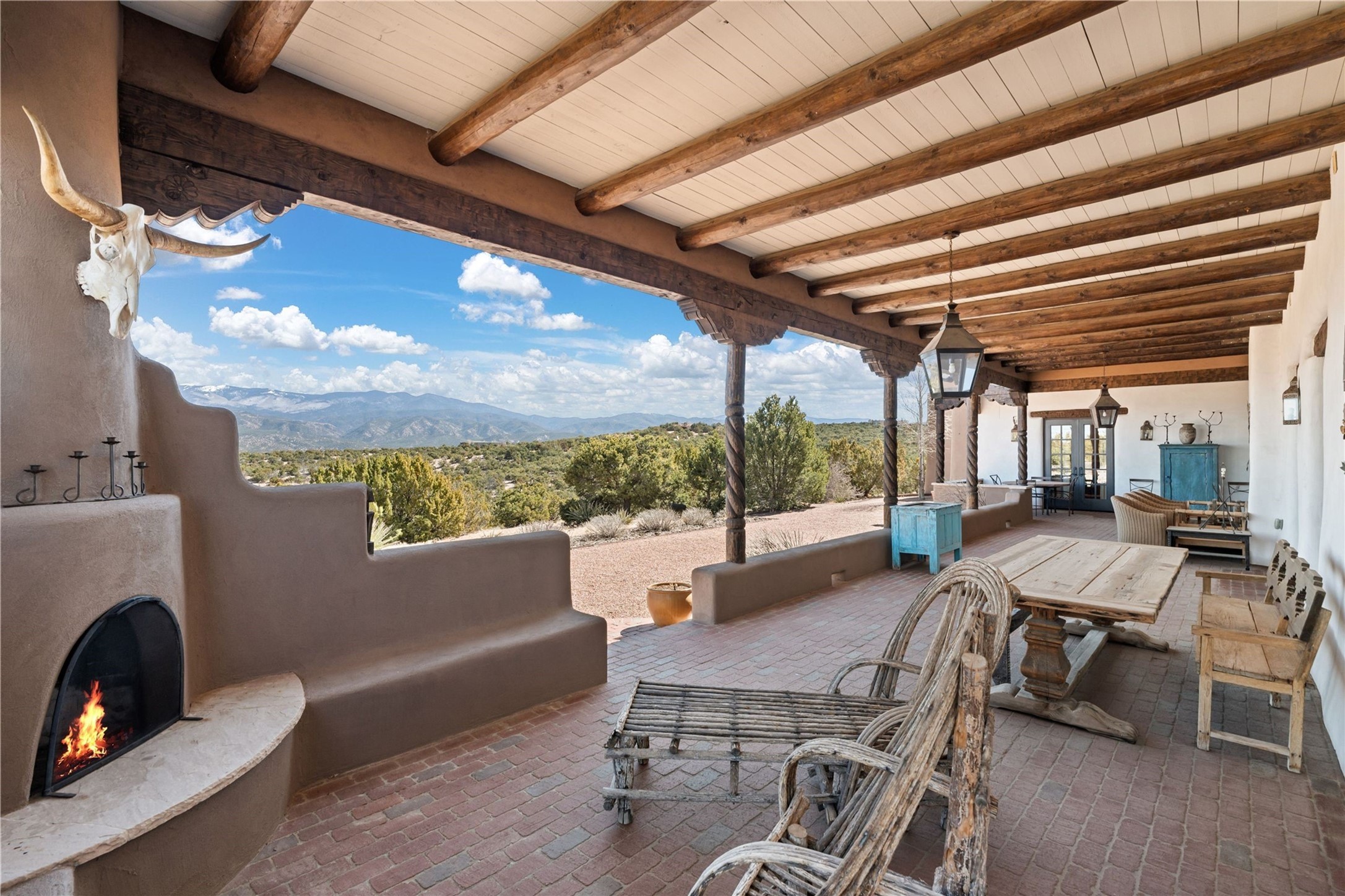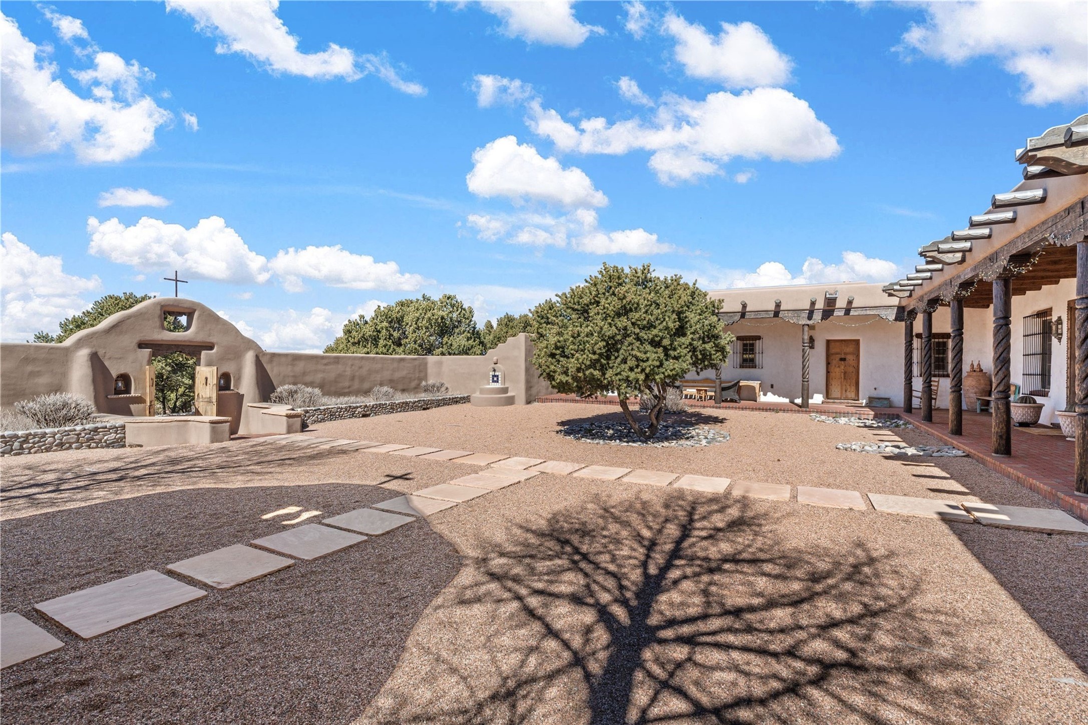 Reminiscent of a colonial hacienda, this impressive estate offers privacy, views, an adobe walled-in main residence and casita, plus a studio/guest house. Beautifully sited on nearly 10 acres (comprised of 2 separately deeded lots), and featuring the highest quality construction (double adobe in the main house). The Main house consists of 2 bedroom suites plus 2 half baths; the Casita consists of 2 bedrooms and 2 baths, and the Studio/Hogan has 1 bedroom,1 bath. There is an expansive portal and a roof top deck, 7 Fireplaces, private well and 12' and 15' Ceilings in public areas. This property is one of Santa Fe's finest.
