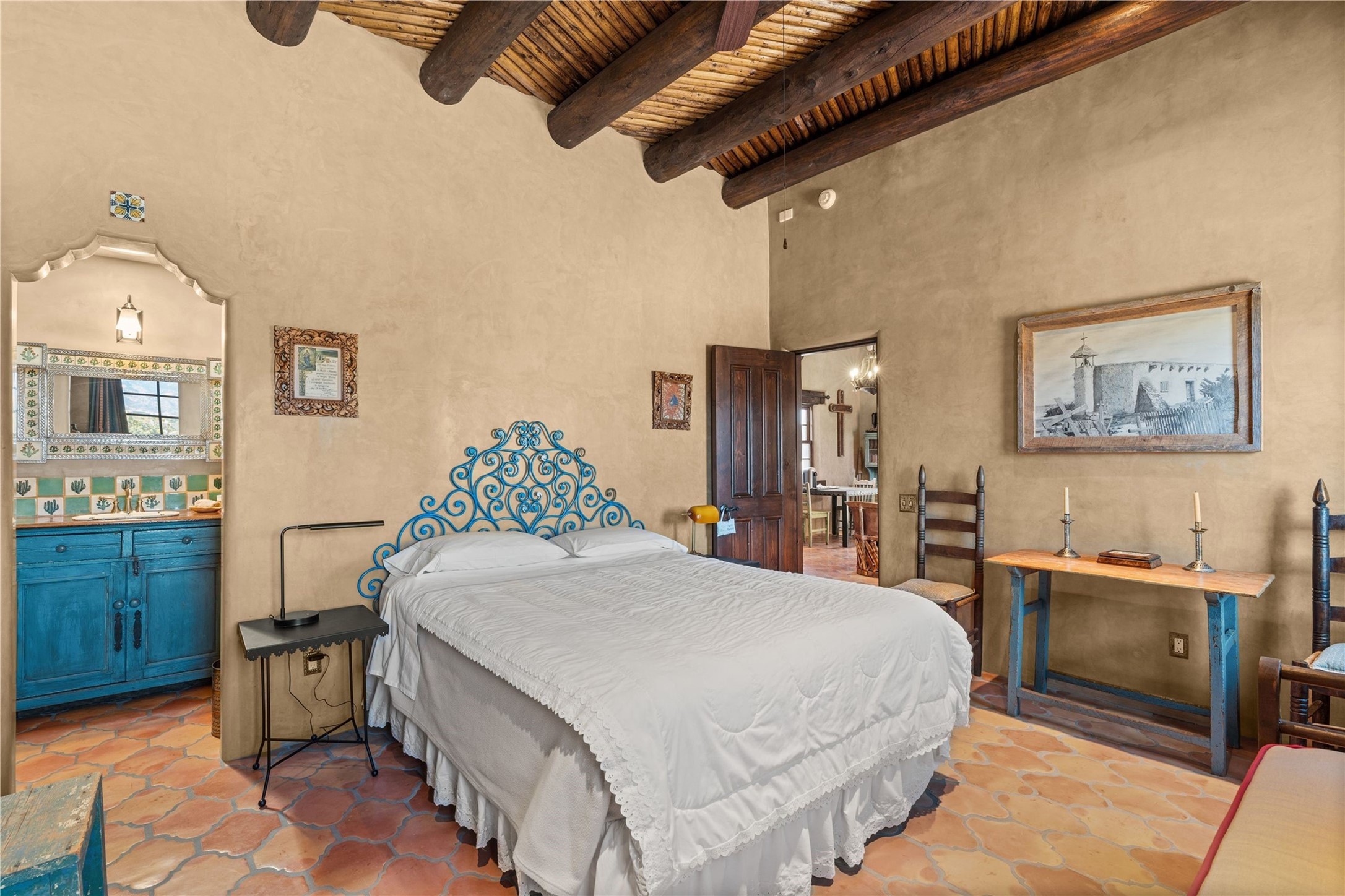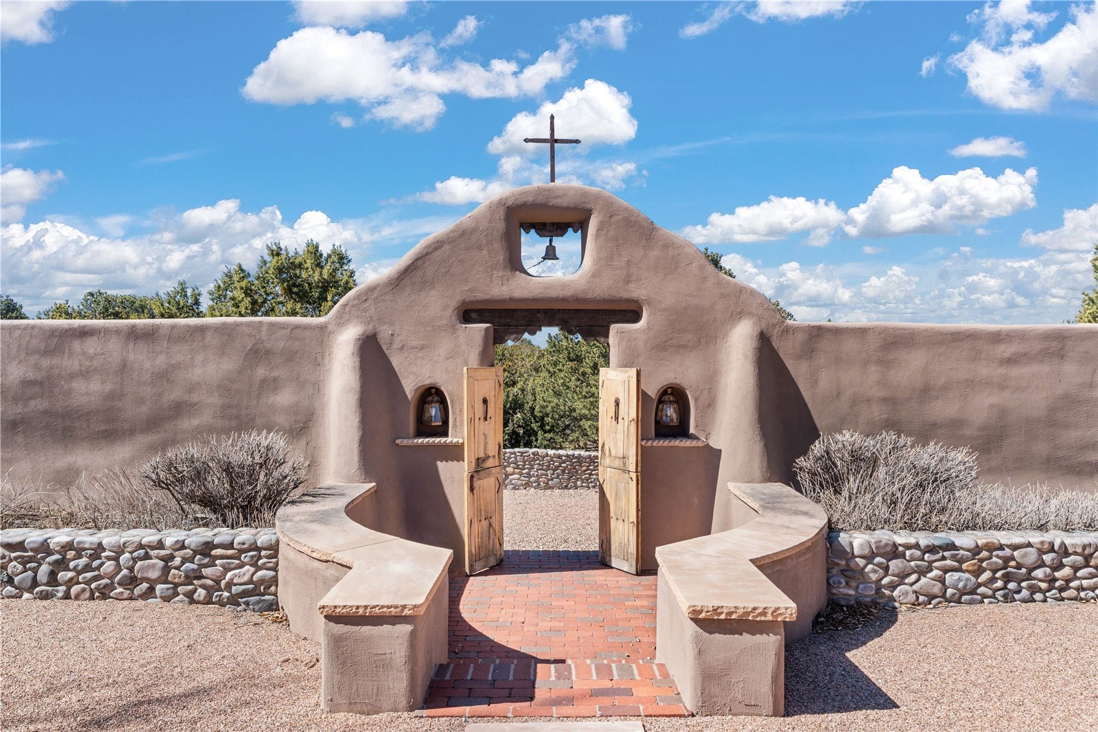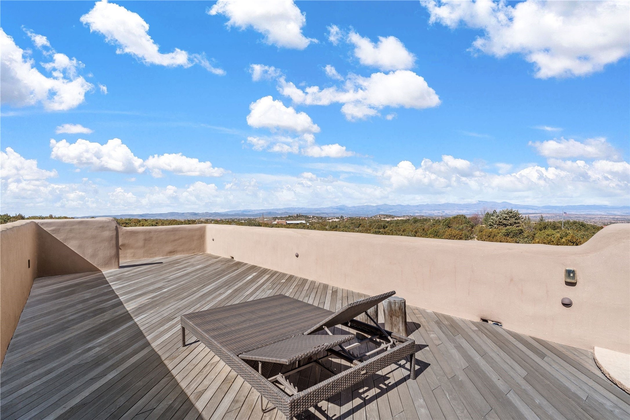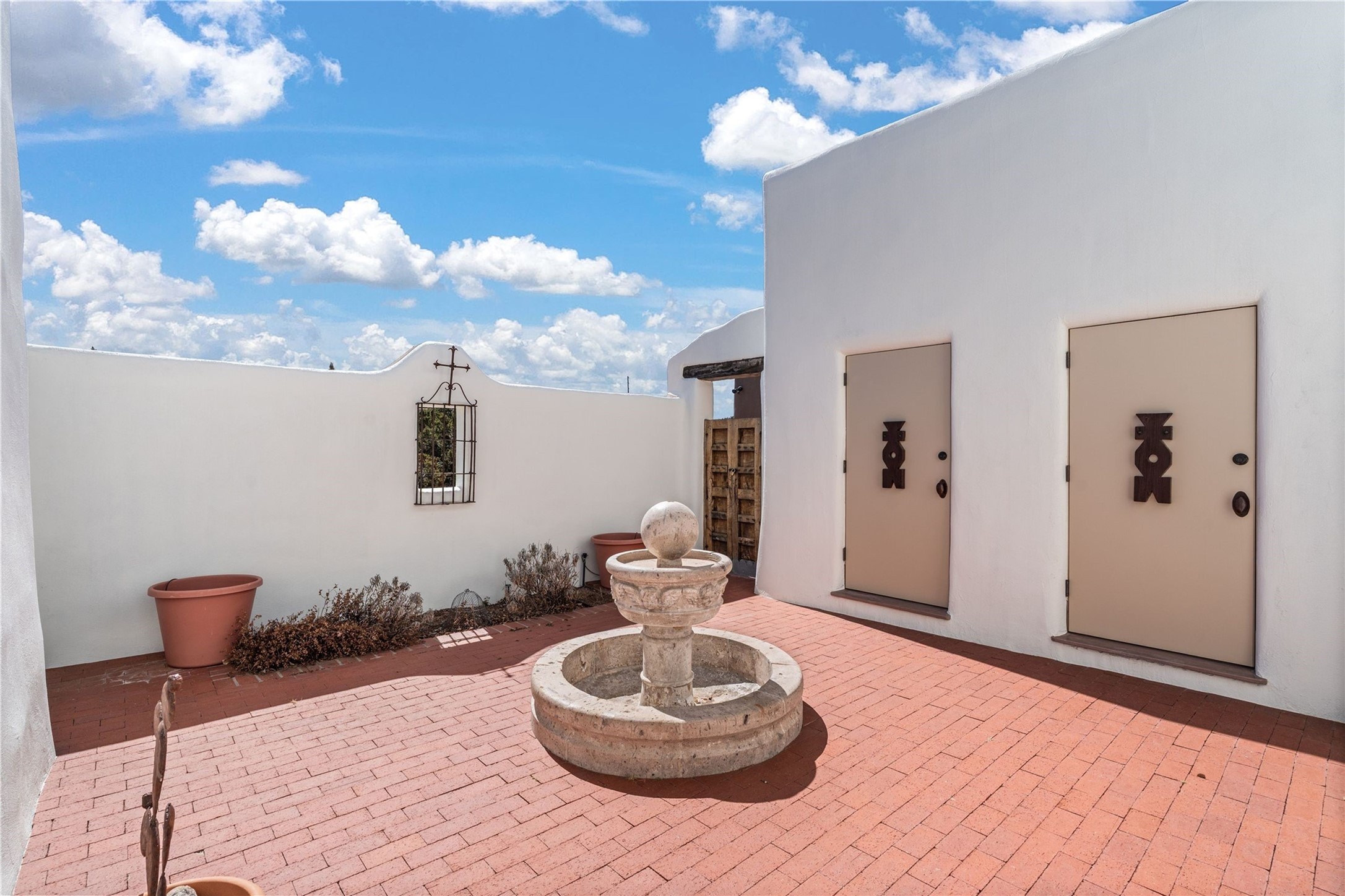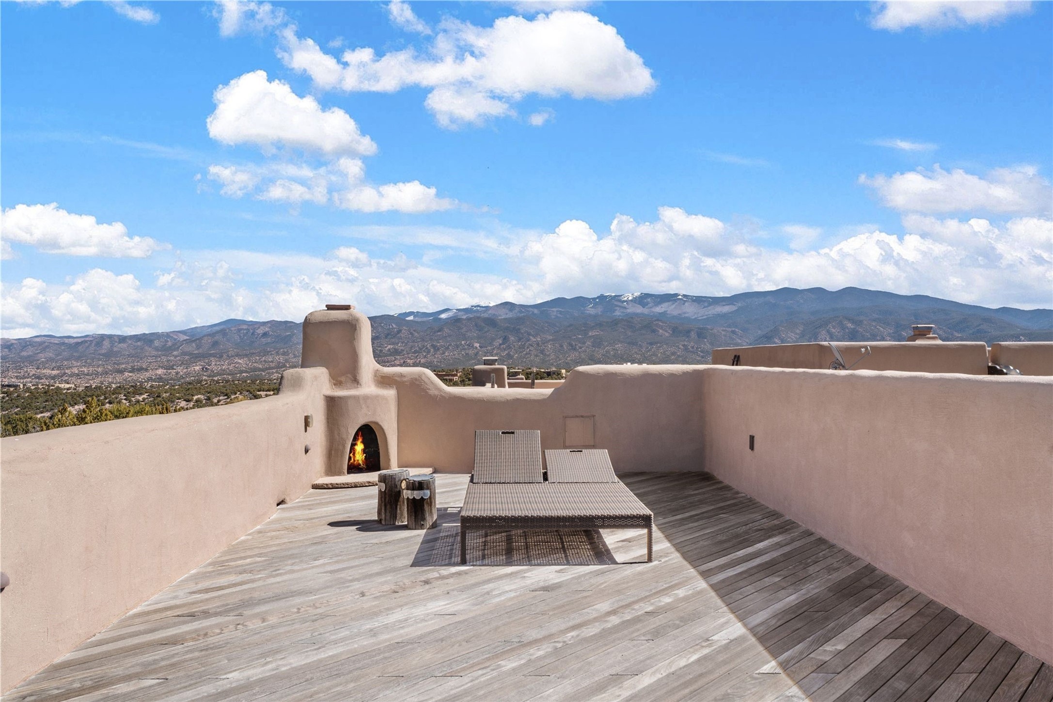 Reminiscent of a colonial hacienda, this impressive estate offers privacy, views, an adobe walled-in main residence and casita, plus a studio/guest house. Beautifully sited on nearly 10 acres (comprised of 2 separately deeded lots), and featuring the highest quality construction (double adobe in the main house). The Main house consists of 2 bedroom suites plus 2 half baths; the Casita consists of 2 bedrooms and 2 baths, and the Studio/Hogan has 1 bedroom,1 bath. There is an expansive portal and a roof top deck, 7 Fireplaces, private well and 12' and 15' Ceilings in public areas. This property is one of Santa Fe's finest.