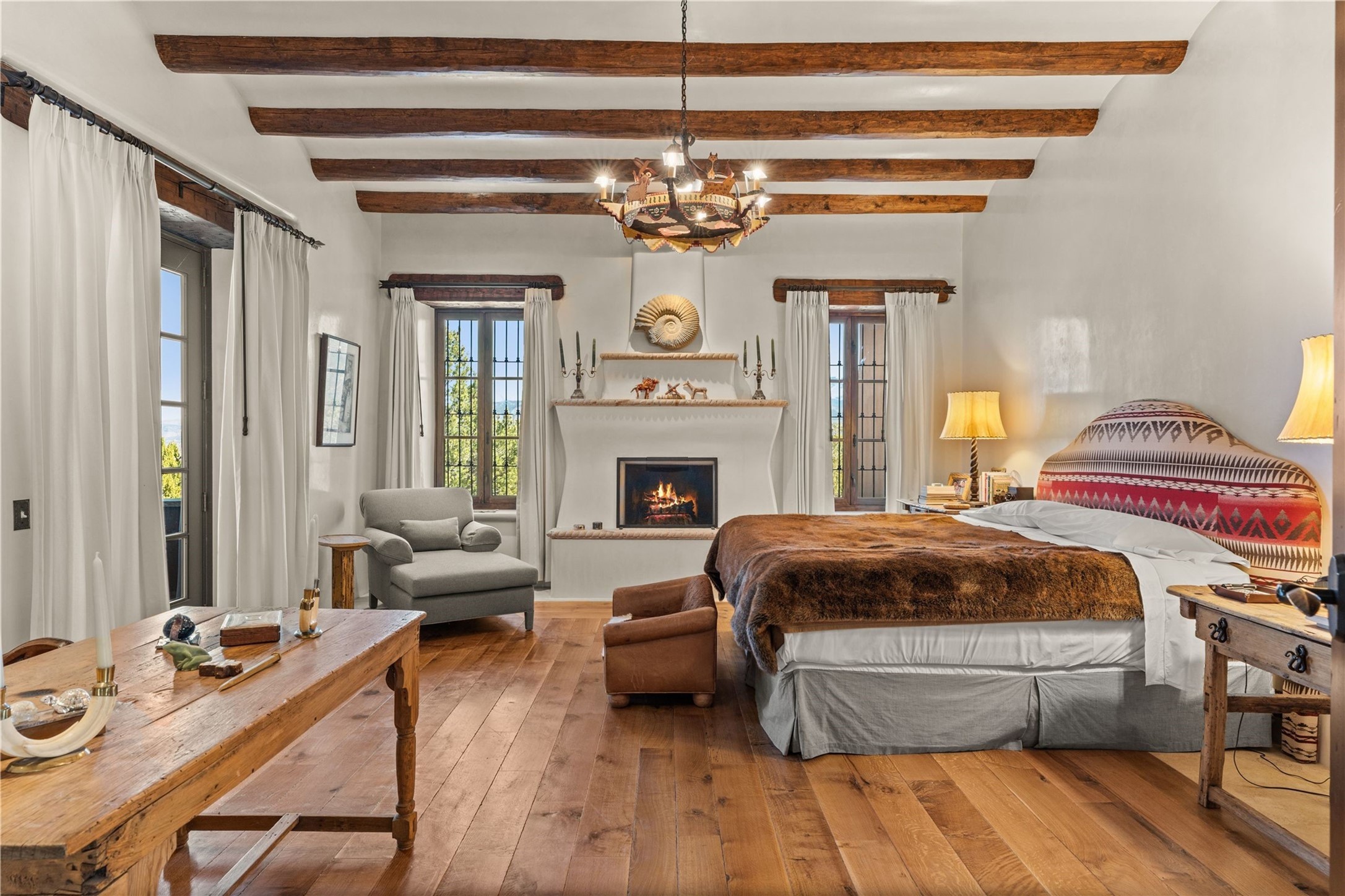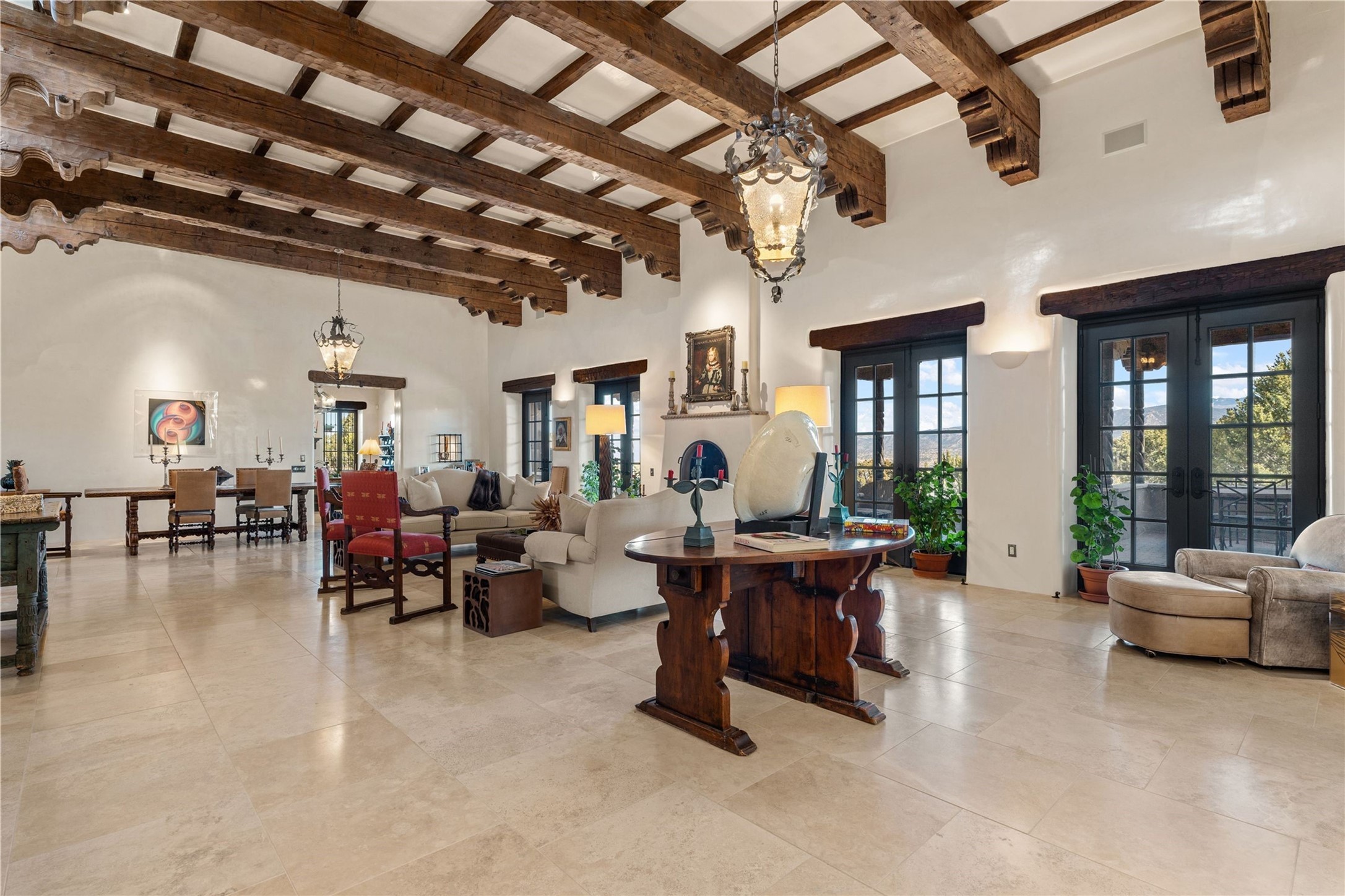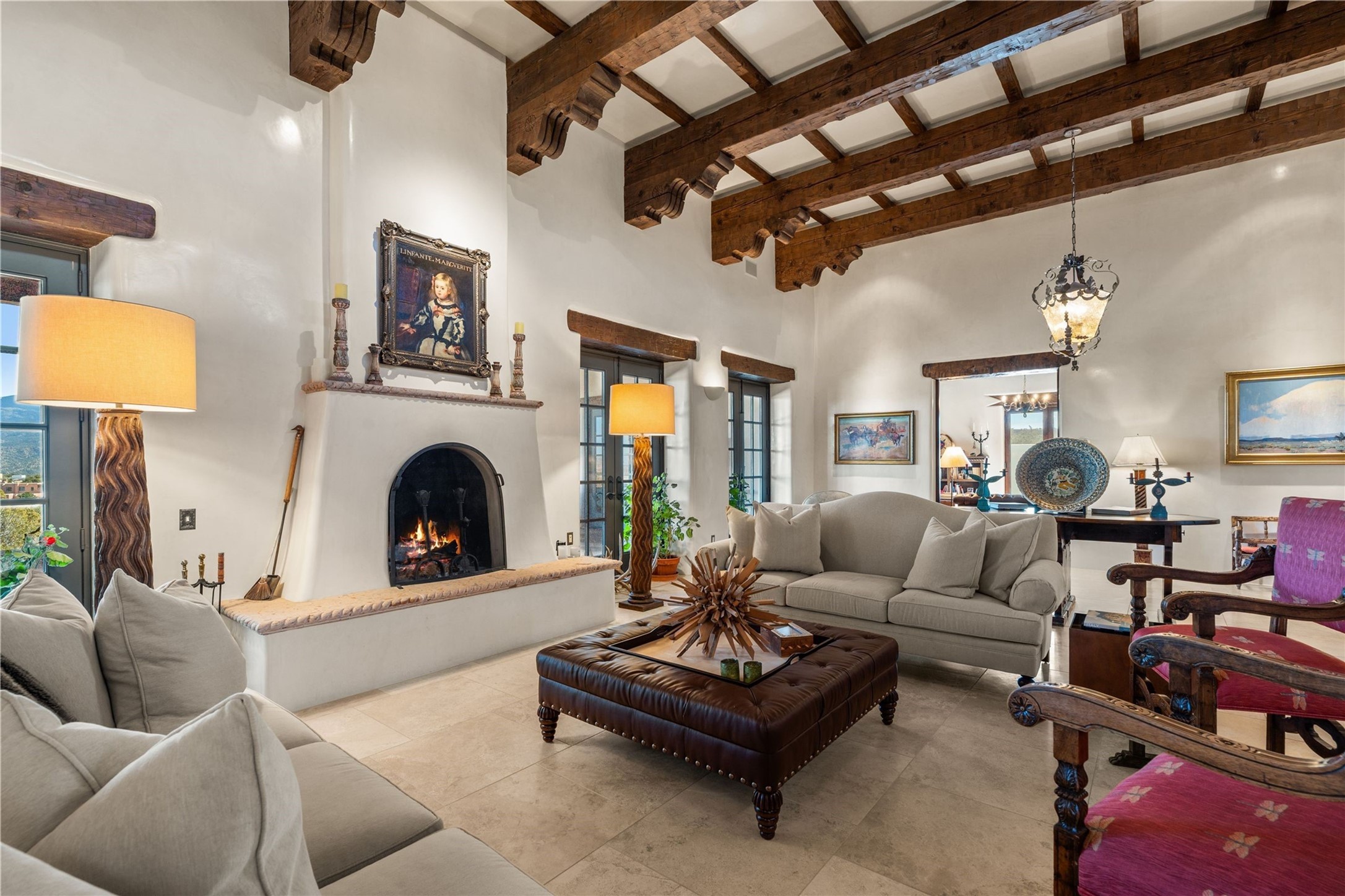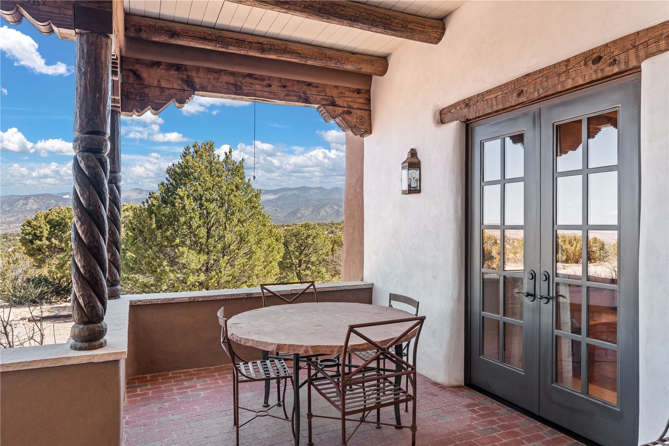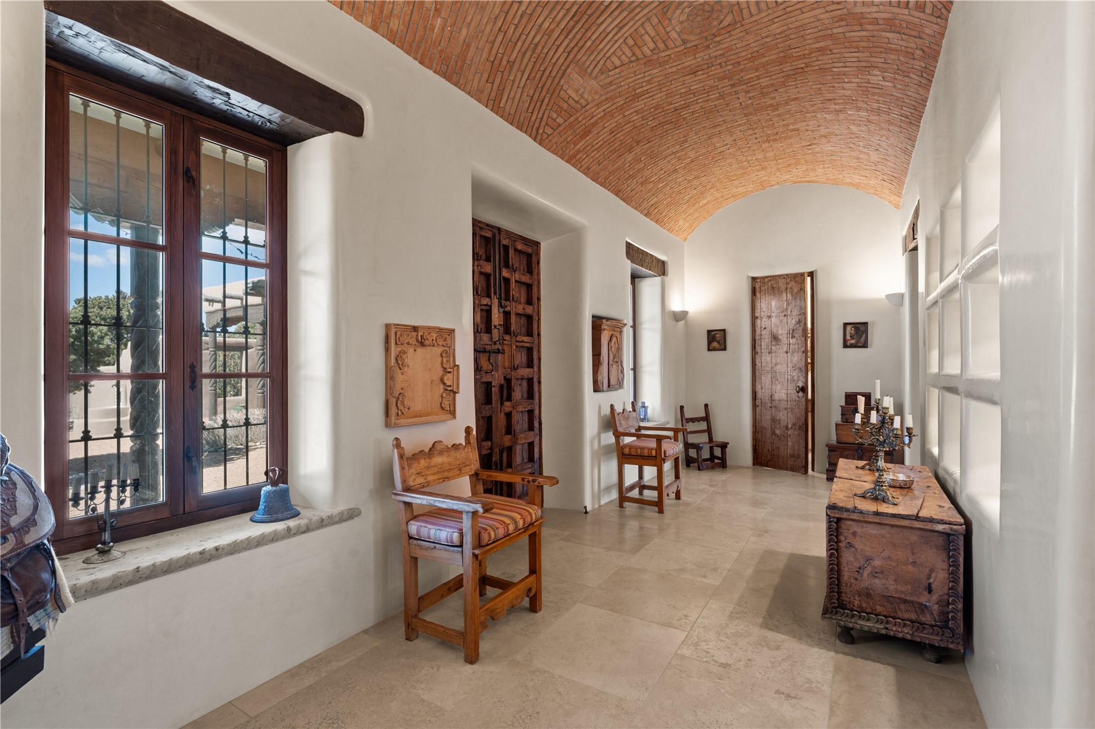 Reminiscent of a colonial hacienda, this impressive estate offers privacy, views, an adobe walled-in main residence and casita, plus a studio/guest house. Beautifully sited on nearly 10 acres (comprised of 2 separately deeded lots), and featuring the highest quality construction (double adobe in the main house). The Main house consists of 2 bedroom suites plus 2 half baths; the Casita consists of 2 bedrooms and 2 baths, and the Studio/Hogan has 1 bedroom,1 bath. There is an expansive portal and a roof top deck, 7 Fireplaces, private well and 12' and 15' Ceilings in public areas. This property is one of Santa Fe's finest.