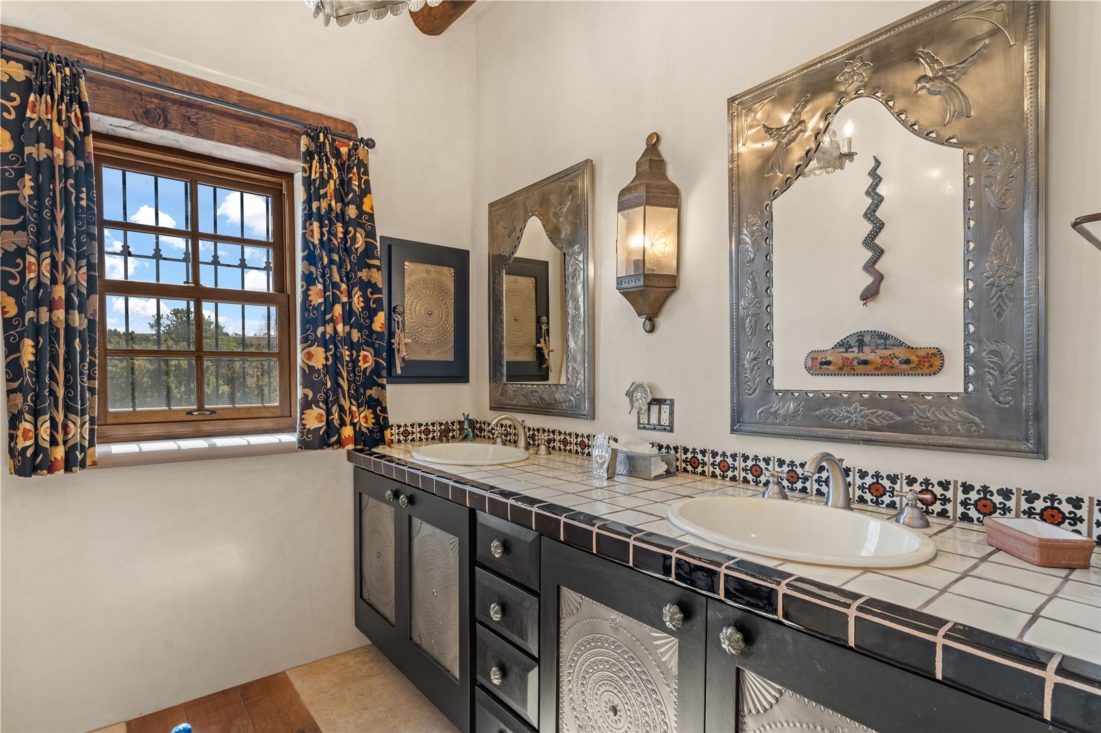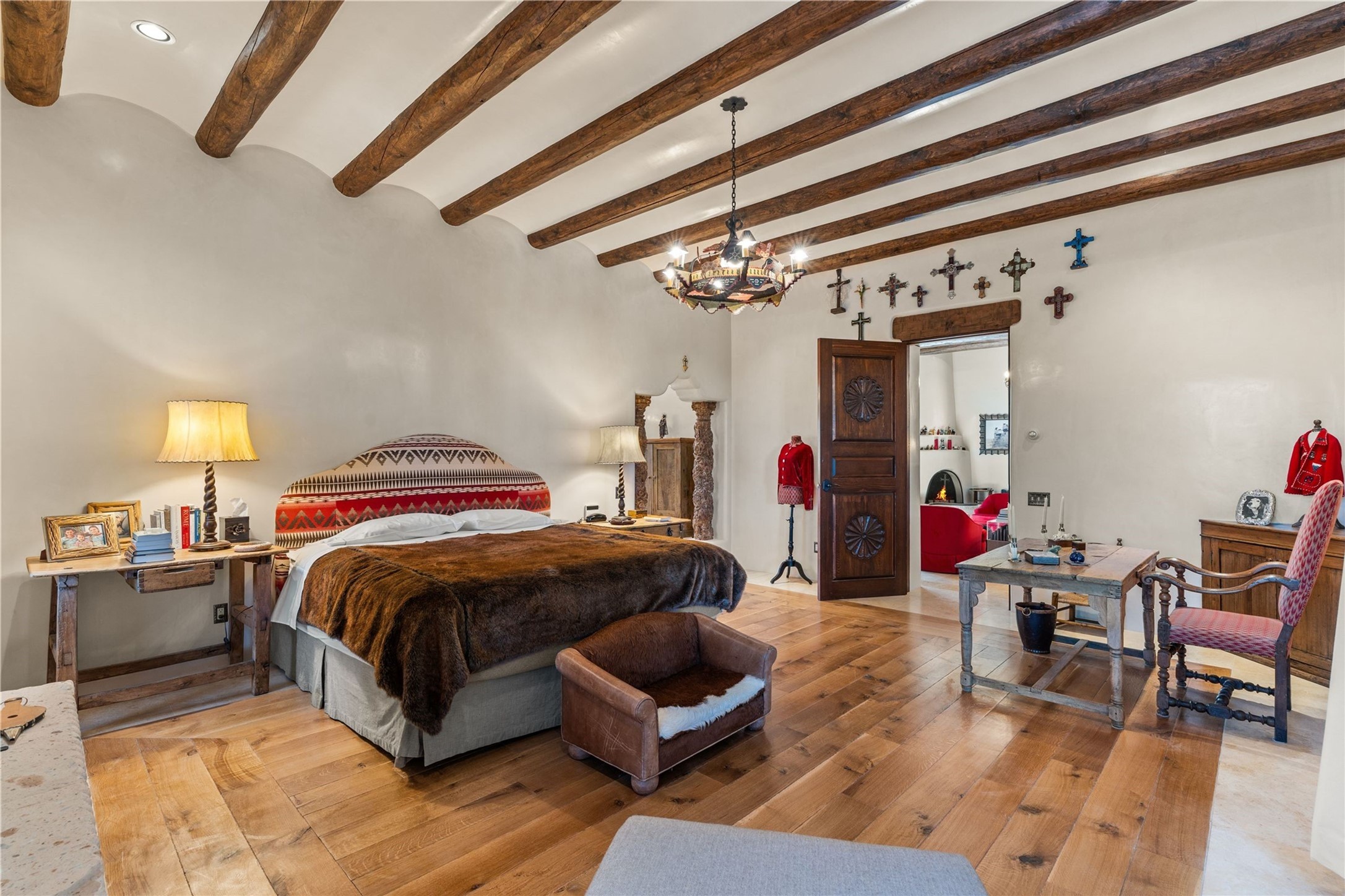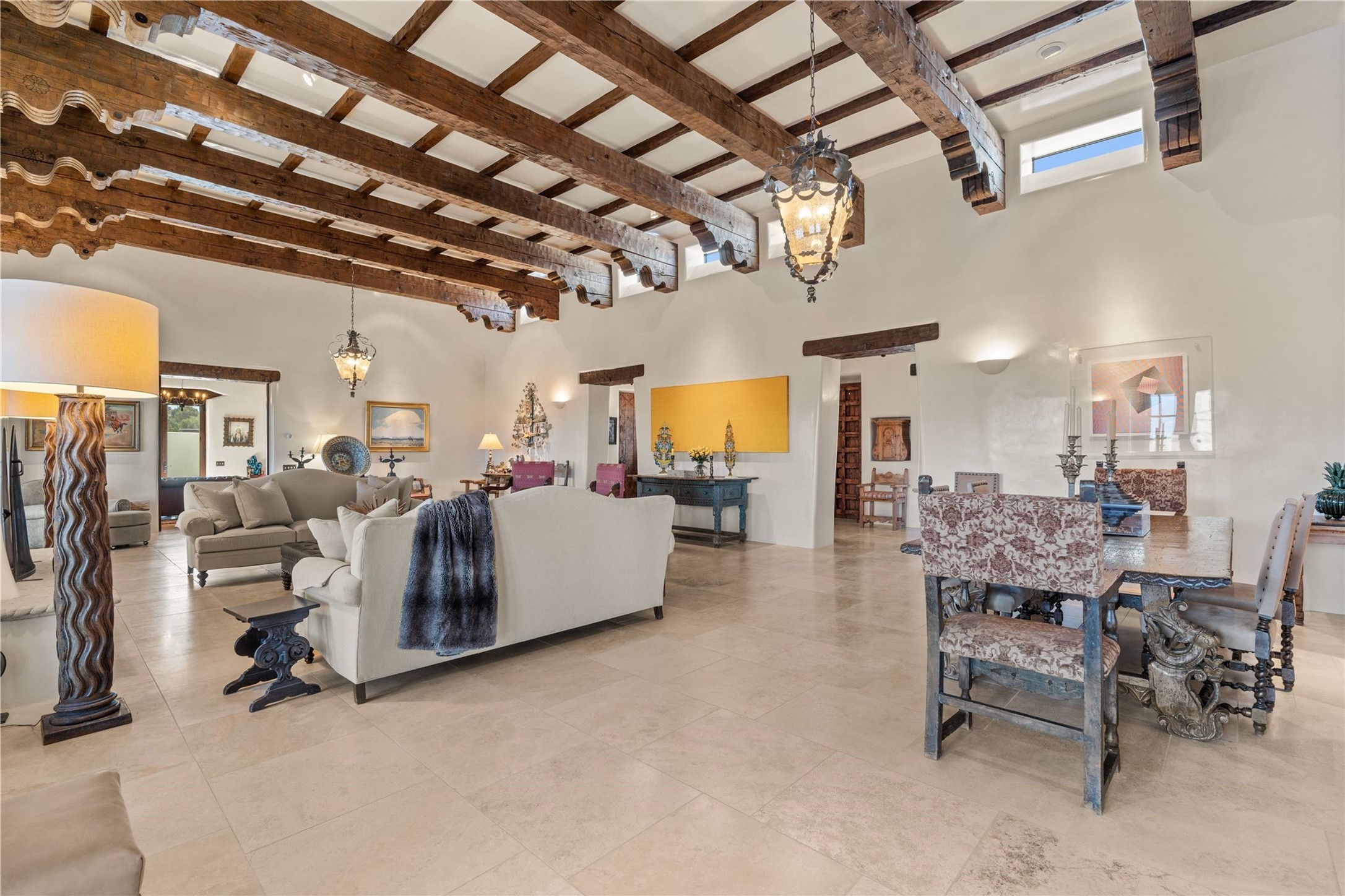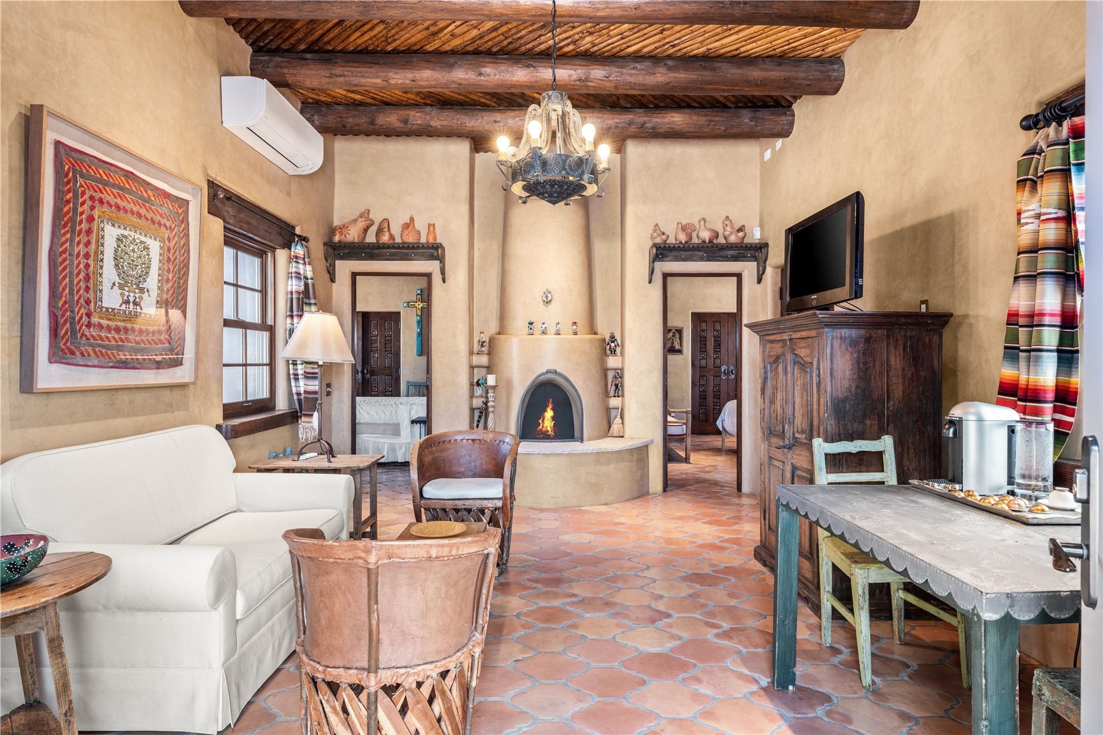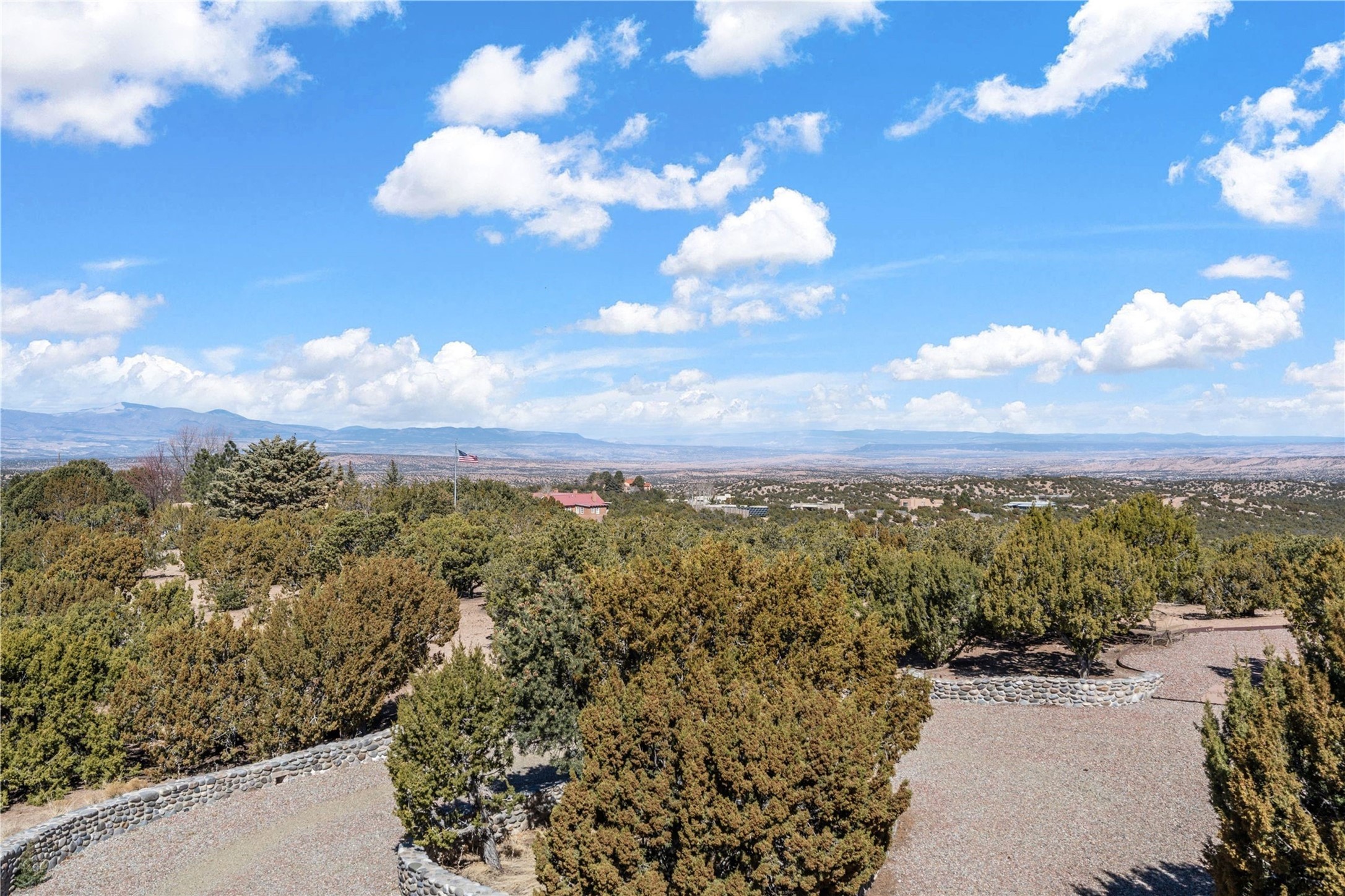 Reminiscent of a colonial hacienda, this impressive estate offers privacy, views, an adobe walled-in main residence and casita, plus a studio/guest house. Beautifully sited on nearly 10 acres (comprised of 2 separately deeded lots), and featuring the highest quality construction (double adobe in the main house). The Main house consists of 2 bedroom suites plus 2 half baths; the Casita consists of 2 bedrooms and 2 baths, and the Studio/Hogan has 1 bedroom,1 bath. There is an expansive portal and a roof top deck, 7 Fireplaces, private well and 12' and 15' Ceilings in public areas. This property is one of Santa Fe's finest.