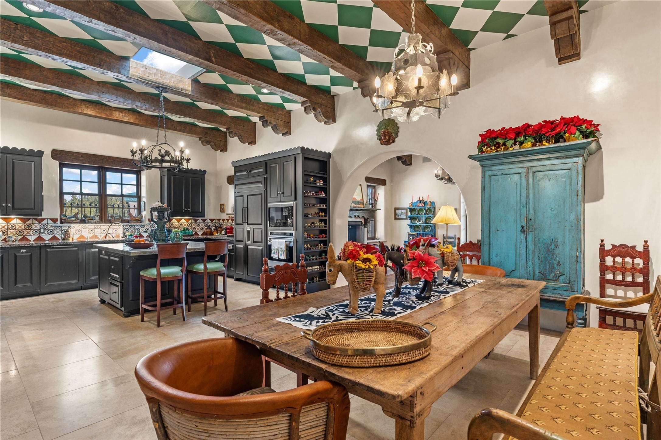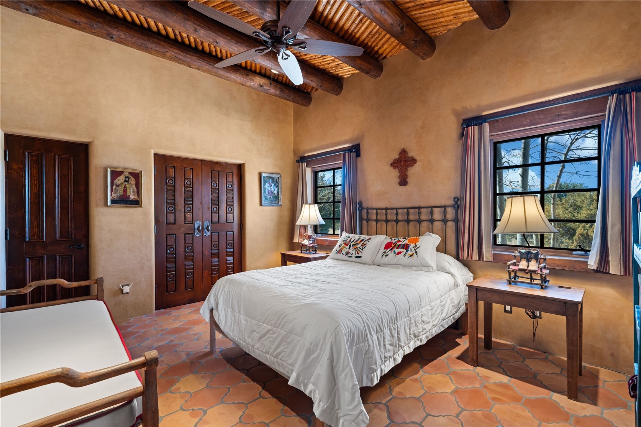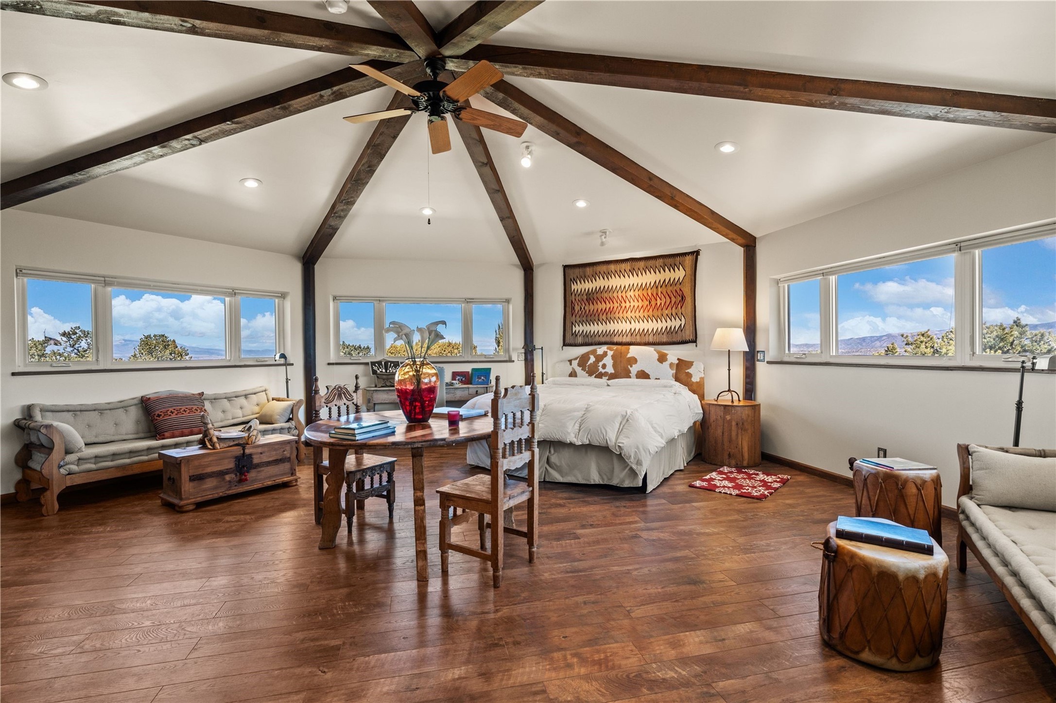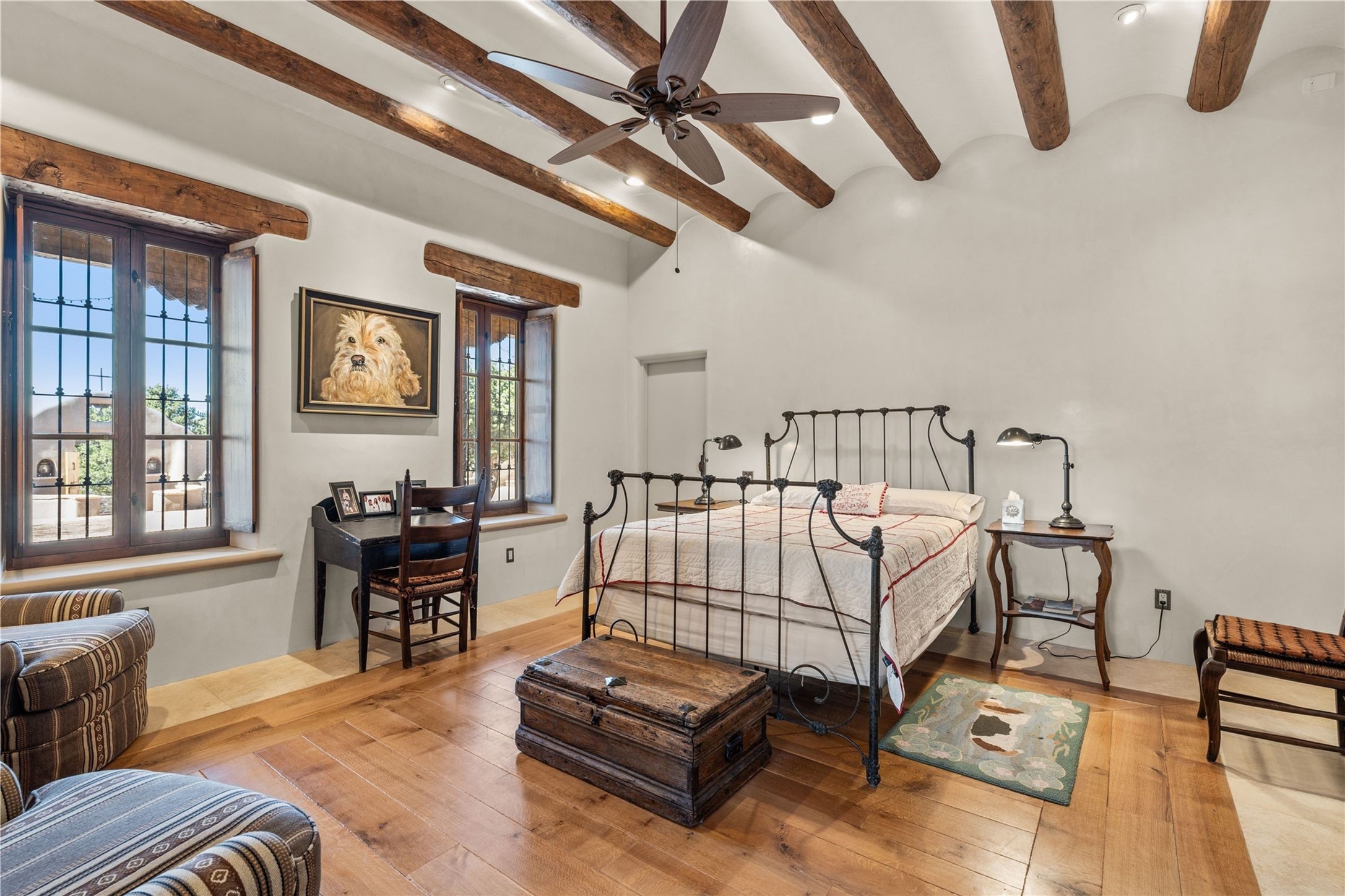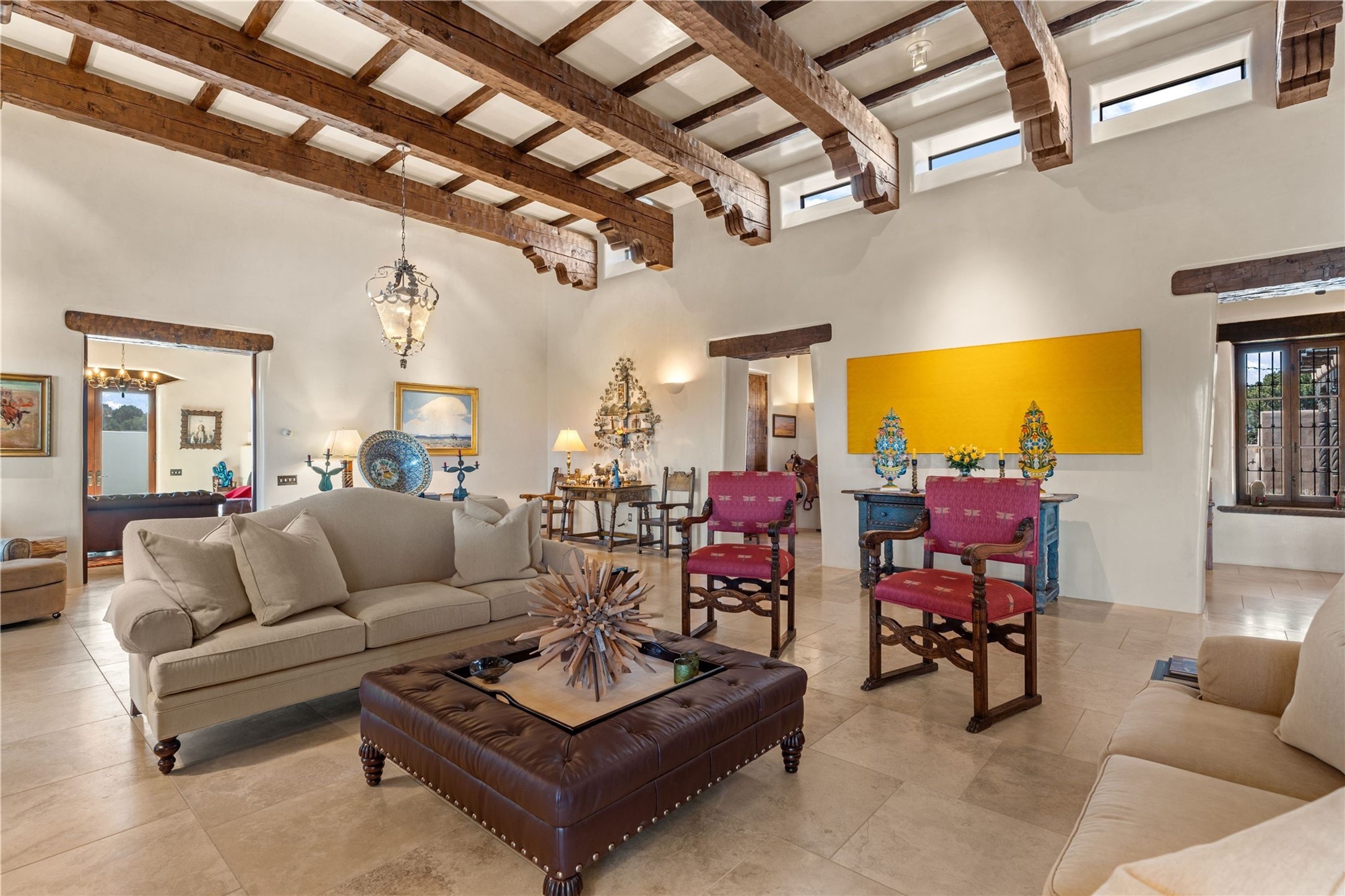 Reminiscent of a colonial hacienda, this impressive estate offers privacy, views, an adobe walled-in main residence and casita, plus a studio/guest house. Beautifully sited on nearly 10 acres (comprised of 2 separately deeded lots), and featuring the highest quality construction (double adobe in the main house). The Main house consists of 2 bedroom suites plus 2 half baths; the Casita consists of 2 bedrooms and 2 baths, and the Studio/Hogan has 1 bedroom,1 bath. There is an expansive portal and a roof top deck, 7 Fireplaces, private well and 12' and 15' Ceilings in public areas. This property is one of Santa Fe's finest.