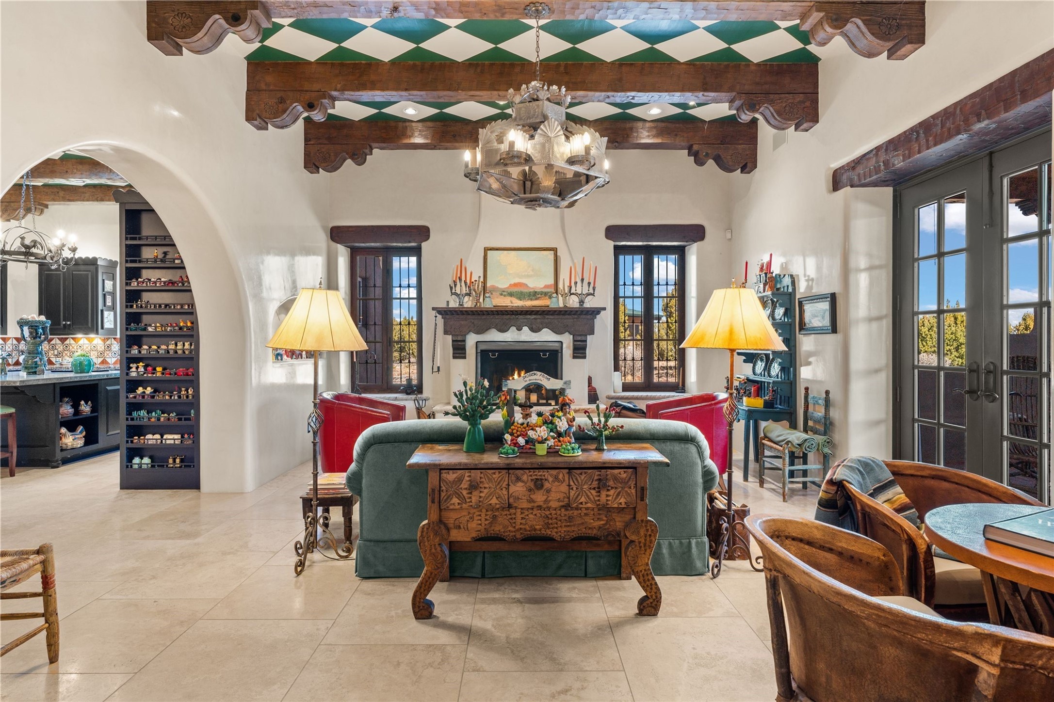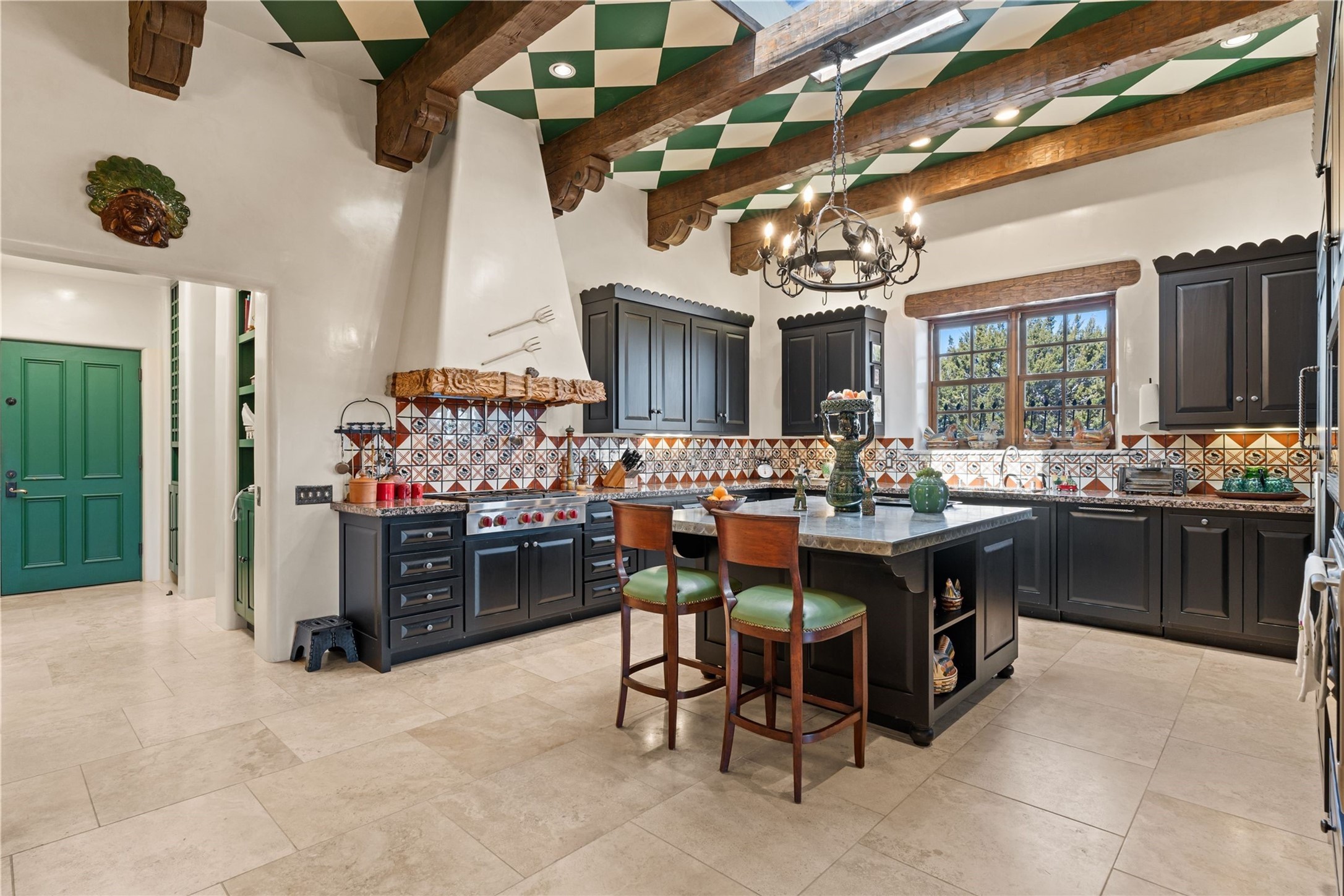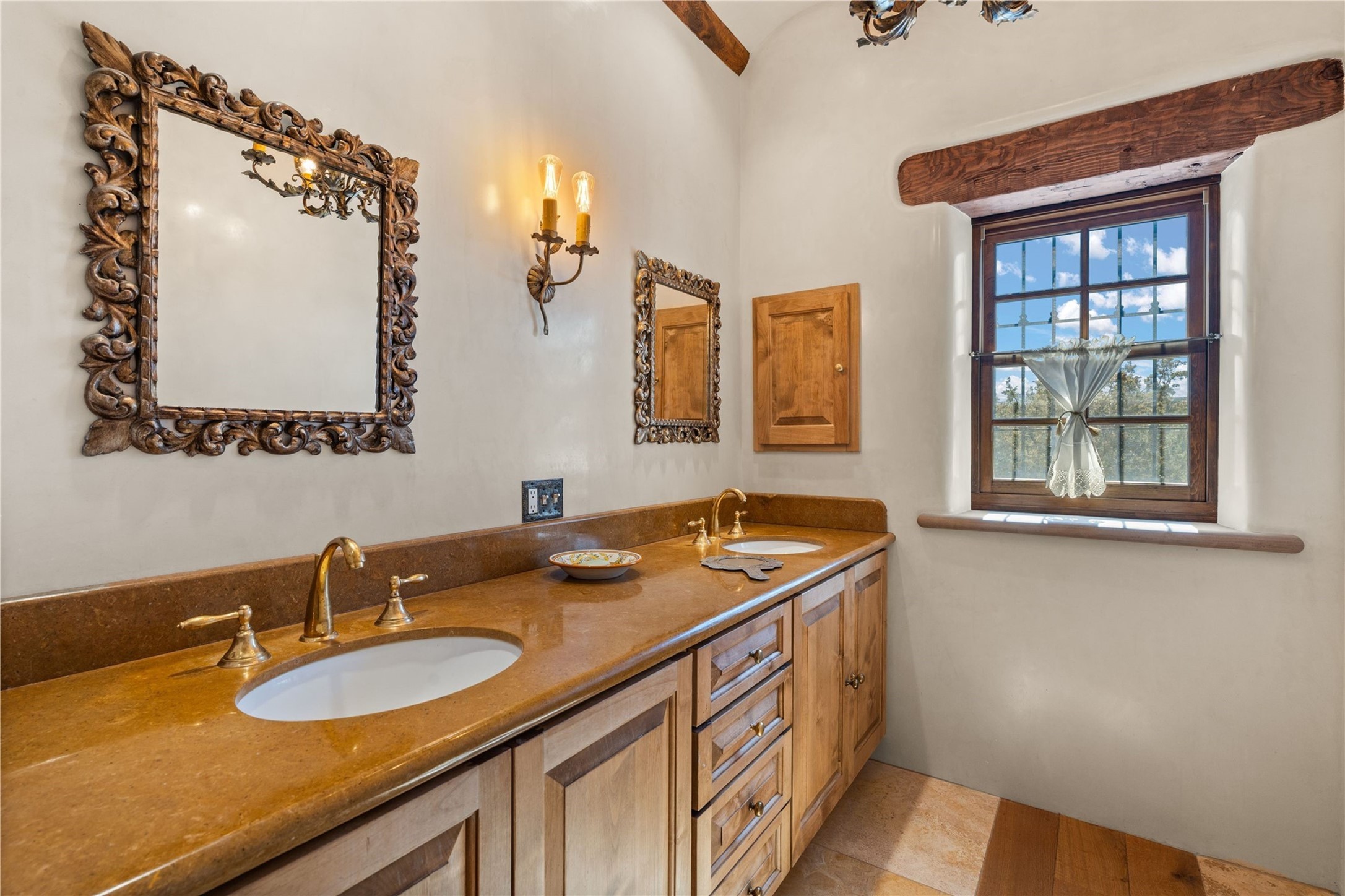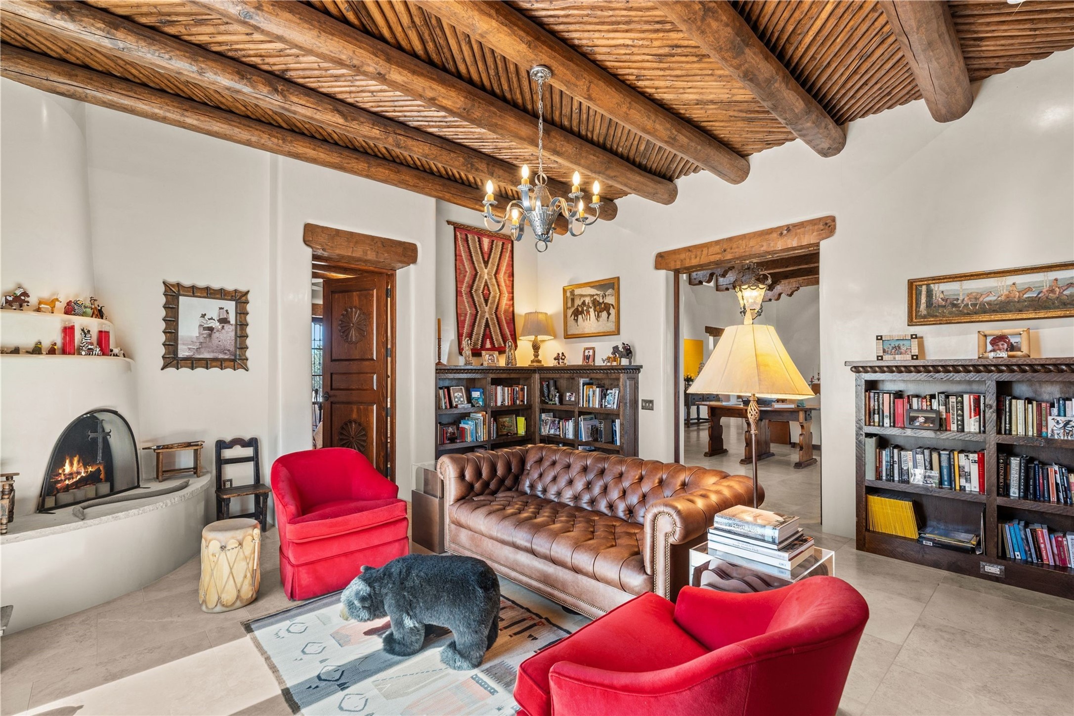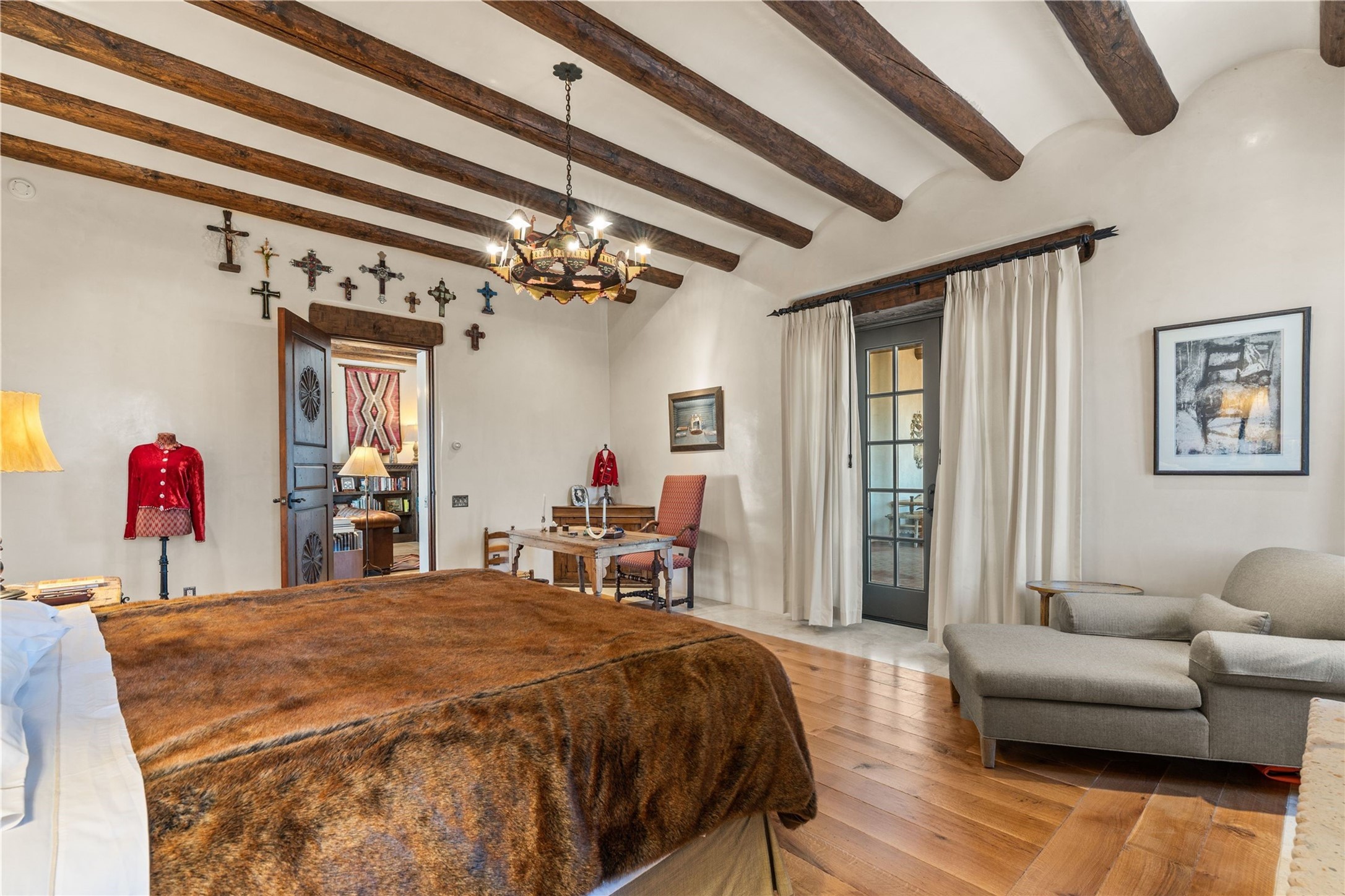 Reminiscent of a colonial hacienda, this impressive estate offers privacy, views, an adobe walled-in main residence and casita, plus a studio/guest house. Beautifully sited on nearly 10 acres (comprised of 2 separately deeded lots), and featuring the highest quality construction (double adobe in the main house). The Main house consists of 2 bedroom suites plus 2 half baths; the Casita consists of 2 bedrooms and 2 baths, and the Studio/Hogan has 1 bedroom,1 bath. There is an expansive portal and a roof top deck, 7 Fireplaces, private well and 12' and 15' Ceilings in public areas. This property is one of Santa Fe's finest.